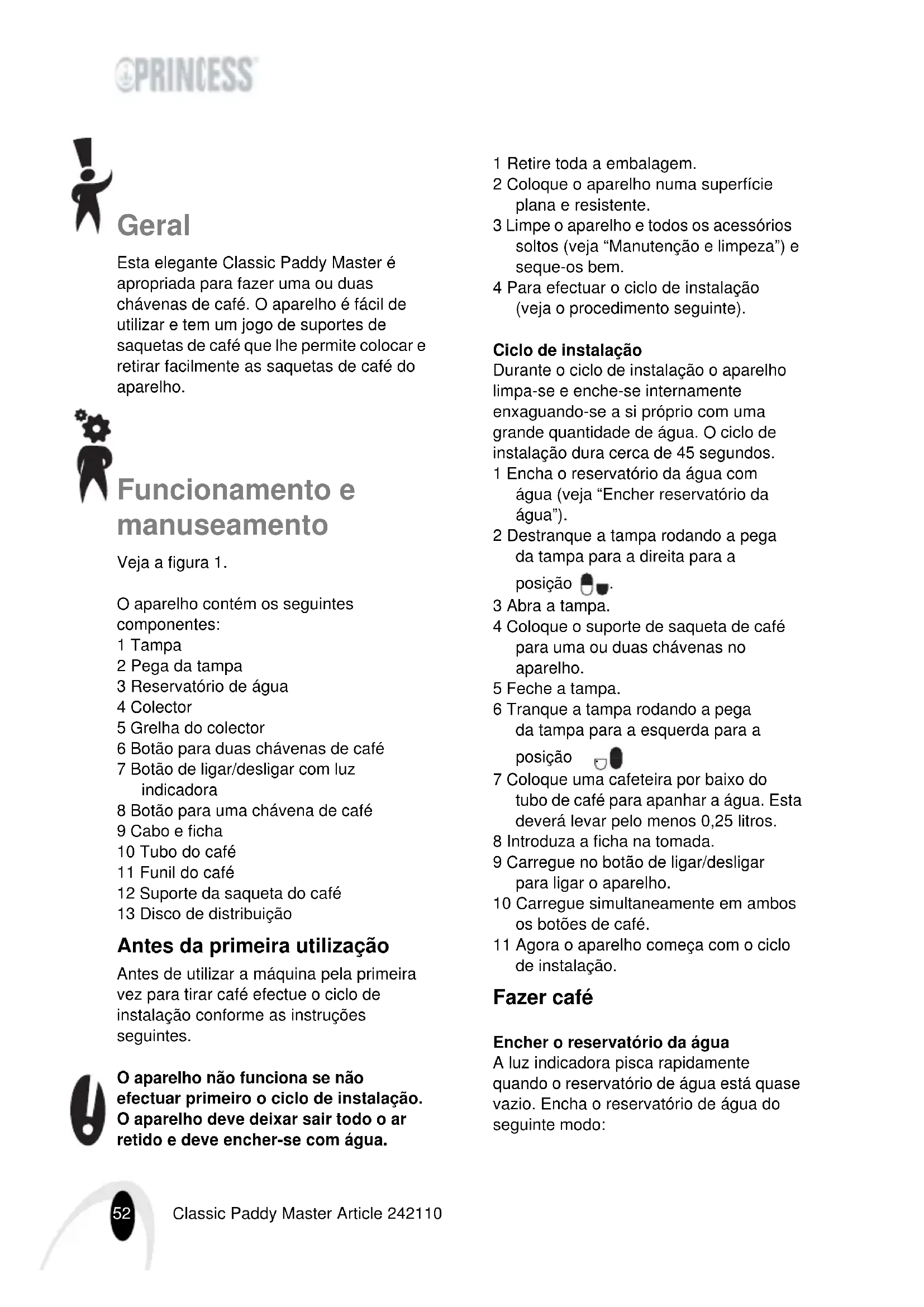- 2002/96/EY Princess_Classic_Paddy_Master_242110.book Page 51 Thursday, November 1, 2007 2:19 PM52 Classic Paddy Master Article 242110 Geral Esta elegante Classic Paddy Master é apropriada para fazer uma ou duas chávenas de café. O aparelho é fácil de utilizar e tem um jogo de suportes de saquetas de café que lhe permite colocar e retirar facilmente as saquetas de café do aparelho. Funcionamento e manuseamento Veja a figura 1. O aparelho contém os seguintes componentes: 1 Tampa 2 Pega da tampa 3 Reservatório de água 4 Colector 5 Grelha do colector 6 Botão para duas chávenas de café 7 Botão de ligar/desligar com luz indicadora 8 Botão para uma chávena de café 9 Cabo e ficha 10 Tubo do café 11 Funil do café 12 Suporte da saqueta do café 13 Disco de distribuição Antes da primeira utilização Antes de utilizar a máquina pela primeira vez para tirar café efectue o ciclo de instalação conforme as instruções seguintes. O aparelho não funciona se não efectuar primeiro o ciclo de instalação. O aparelho deve deixar sair todo o ar retido e deve encher-se com água. 1 Retire toda a embalagem. 2 Coloque o aparelho numa superfície plana e resistente. 3 Limpe o aparelho e todos os acessórios soltos (veja “Manutenção e limpeza”) e seque-os bem. 4 Para efectuar o ciclo de instalação (veja o procedimento seguinte). Ciclo de instalação Durante o ciclo de instalação o aparelho limpa-se e enche-se internamente enxaguando-se a si próprio com uma grande quantidade de água. O ciclo de instalação dura cerca de 45 segundos. 1 Encha o reservatório da água com água (veja “Encher reservatório da água”). 2 Destranque a tampa rodando a pega da tampa para a direita para a posição . 3 Abra a tampa. 4 Coloque o suporte de saqueta de café para uma ou duas chávenas no aparelho. 5 Feche a tampa. 6 Tranque a tampa rodando a pega da tampa para a esquerda para a posição . 7 Coloque uma cafeteira por baixo do tubo de café para apanhar a água. Esta deverá levar pelo menos 0,25 litros. 8 Introduza a ficha na tomada. 9 Carregue no botão de ligar/desligar para ligar o aparelho. 10 Carregue simultaneamente em ambos os botões de café. 11 Agora o aparelho começa com o ciclo de instalação. Fazer café Encher o reservatório da água A luz indicadora pisca rapidamente quando o reservatório de água está quase vazio. Encha o reservatório de água do seguinte modo: Princess_Classic_Paddy_Master_242110.book Page 52 Thursday, November 1, 2007 2:19 PM53 Classic Paddy Master Article 242110 1 Retire o reservatório da água do aparelho. 2 Encha o reservatório da água com água fria até à marcação de MAX. 3 Coloque o reservatório da água novamente no aparelho. Fazer café