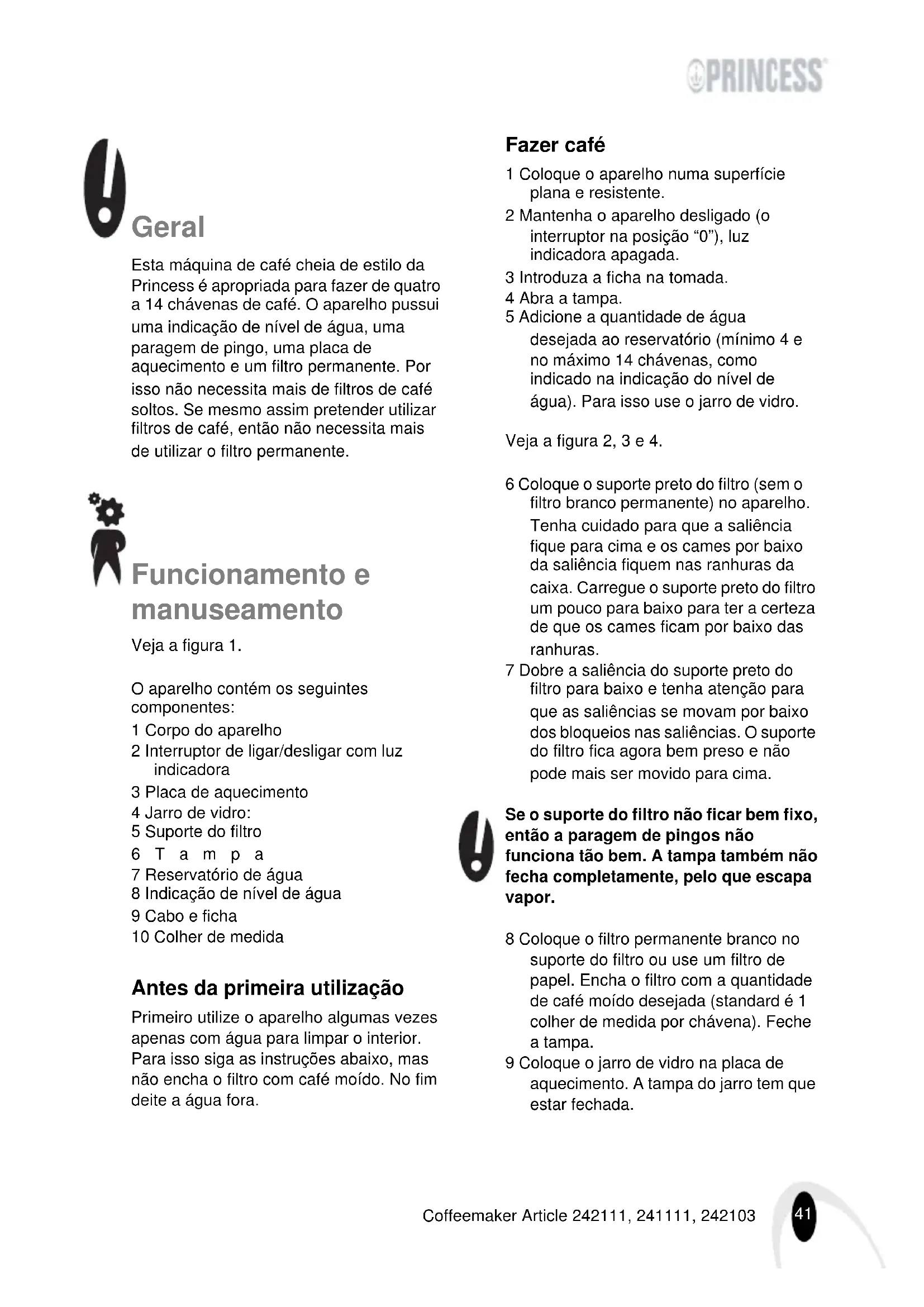 - Puhdista keitin huolellisesti käytön jälkeen (katso ‘Puhdistus ja huolto’). Anna keittimen jäähtyä täysin ennen sen puhdistamista, huoltamista tai asettamista säilytykseen. Ympäristö Vie pakkausmateriaalit, kuten muovi ja pahvirasiat, asianmukaisiin jätteidenkeräyspisteisiin. Varmista keittimen kierrätys halutessasi heittää sen pois sen vielä toimiessa tai tarvitessa vain vähäistä huoltoa. Kun keitin saavuttaa käyttöikänsä pään, se on hävitettävä vastuullisesti, varmistaen että se ja sen osat kierrätetään. Älä hävitä keitintä sekajätteiden mukana; toimita se liikkeeseen tai muuhun valtuutettuun keräyspisteeseen. Ota yhteyttä paikallisviranomaisiin saadaksesi tietoa jätteiden vastaanotto- ja keräyspisteistä asuinalueellasi.41 Coffeemaker Article 242111, 241111, 242103 Geral Esta máquina de café cheia de estilo da Princess é apropriada para fazer de quatro a 14 chávenas de café. O aparelho pussui uma indicação de nível de água, uma paragem de pingo, uma placa de aquecimento e um filtro permanente. Por isso não necessita mais de filtros de café soltos. Se mesmo assim pretender utilizar filtros de café, então não necessita mais de utilizar o filtro permanente. Funcionamento e manuseamento Veja a figura 1. O aparelho contém os seguintes componentes: 1 Corpo do aparelho 2 Interruptor de ligar/desligar com luz indicadora 3 Placa de aquecimento 4 Jarro de vidro: 5 Suporte do filtro 6Tampa 7 Reservatório de água 8 Indicação de nível de água 9 Cabo e ficha 10 Colher de medida Antes da primeira utilização Primeiro utilize o aparelho algumas vezes apenas com água para limpar o interior. Para isso siga as instruções abaixo, mas não encha o filtro com café moído. No fim deite a água fora. Fazer café 1 Coloque o aparelho numa superfície plana e resistente. 2 Mantenha o aparelho desligado (o interruptor na posição “0”), luz indicadora apagada. 3 Introduza a ficha na tomada. 4 Abra a tampa. 5 Adicione a quantidade de água desejada ao reservatório (mínimo 4 e no máximo 14 chávenas, como indicado na indicação do nível de água). Para isso use o jarro de vidro. Veja a figura 2, 3 e 4. 6 Coloque o suporte preto do filtro (sem o filtro branco permanente) no aparelho. Tenha cuidado para que a saliência fique para cima e os cames por baixo da saliência fiquem nas ranhuras da caixa. Carregue o suporte preto do filtro um pouco para baixo para ter a certeza de que os cames ficam por baixo das ranhuras. 7 Dobre a saliência do suporte preto do filtro para baixo e tenha atenção para que as saliências se movam por baixo dos bloqueios nas saliências. O suporte do filtro fica agora bem preso e não pode mais ser movido para cima. Se o suporte do filtro não ficar bem fixo, então a paragem de pingos não funciona tão bem. A tampa também não fecha completamente, pelo que escapa vapor. 8 Coloque o filtro permanente branco no suporte do filtro ou use um filtro de papel. Encha o filtro com a quantidade de café moído desejada (standard é 1 colher de medida por chávena). Feche a tampa. 9 Coloque o jarro de vidro na placa de aquecimento. A tampa do jarro tem que estar fechada.42 Coffeemaker Article 242111, 241111, 242103 10 Ligue o aparelho (interruptor na posição “1”). A luz indicadora de ligar/ desligar acende. O café está a ser feito. A placa de aquecimento mantém o café à temperatura. 11 Tire o jarro de vidro da placa de aquecimento para deitar café numa chávena. O aparelho tem uma paragem de pingos. Não é necessário ter que fazer o café todo antes de poder retirar o jarro da placa de aquecimento. 12 Depois de utilizar desligue o aparelho (interruptor na posição “0”) e retire a ficha da tomada. Manutenção e limpeza