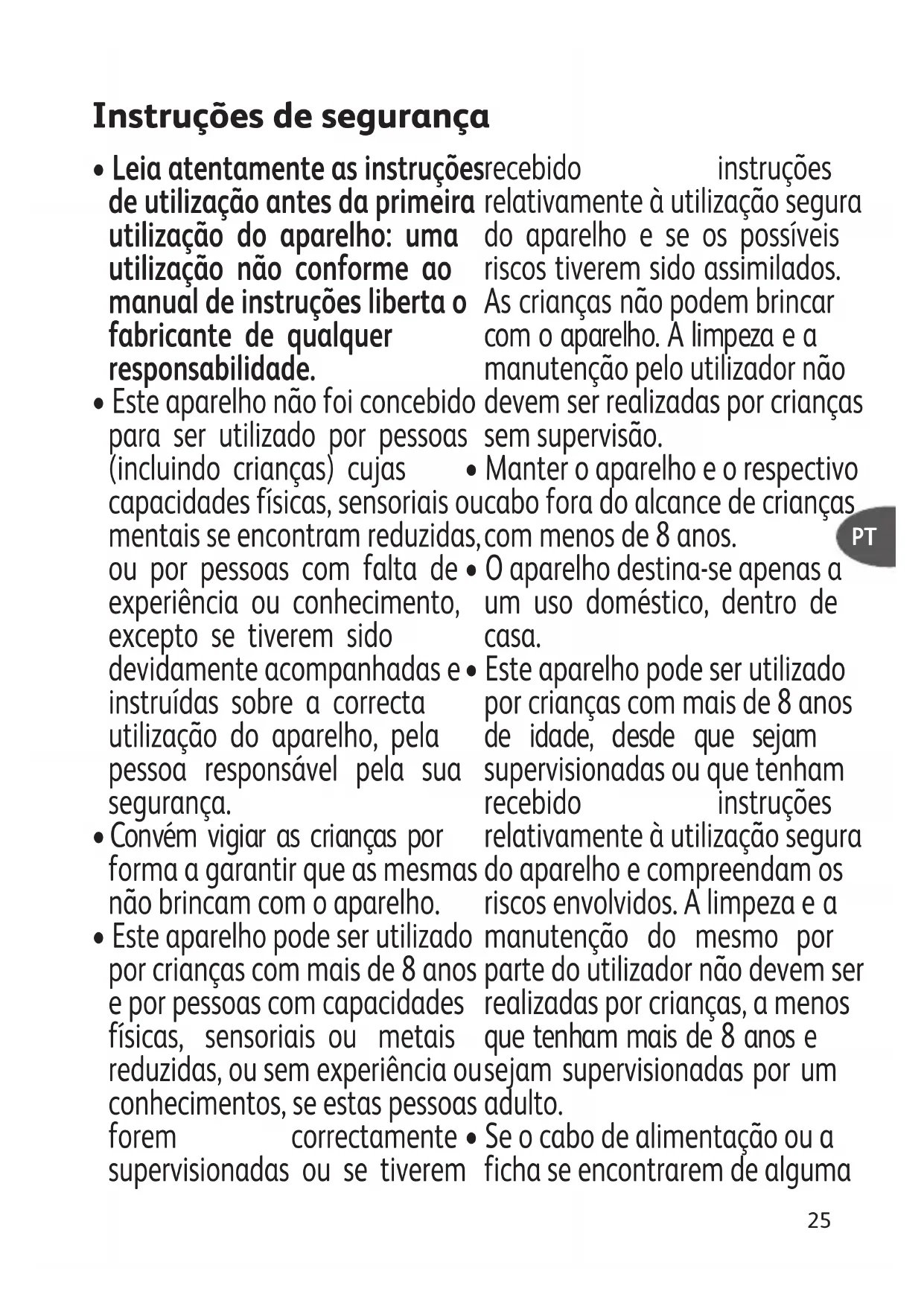 - Este aparelho pode ser utilizado por crianças com mais de 8 anos de idade, desde que sejam supervisionadas ou que tenham recebido instruções relativamente à utilização segura do aparelho e compreendam os riscos envolvidos. A limpeza e a manutenção do mesmo por parte do utilizador não devem ser realizadas por crianças, a menos que tenham mais de 8 anos e sejam supervisionadas por um adulto.