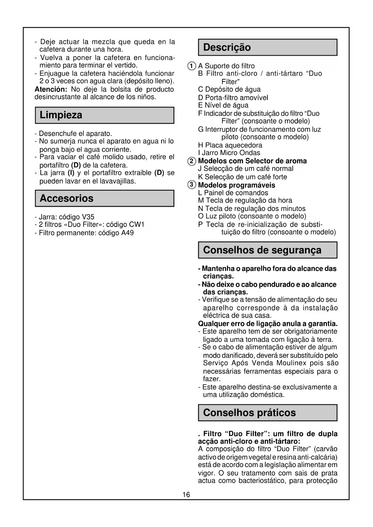- Deje actuar la mezcla que queda en la cafetera durante una hora. - Vuelva a poner la cafetera en funciona- miento para terminar el vertido. - Enjuague la cafetera haciéndola funcionar 2 o 3 veces con agua clara (depósito lleno). Atención: No deje la bolsita de producto desincrustante al alcance de los niños. Limpieza - Desenchufe el aparato. - No sumerja nunca el aparato en agua ni lo ponga bajo el agua corriente. - Para vaciar el café molido usado, retire el portafiltro (D) de la cafetera. - La jarra (I) y el portafiltro extraible (D) se pueden lavar en el lavavajillas. Accesorios - Jarra: código V35 - 2 filtros «Duo Filter»: código CW1 - Filtro permanente: código A49 Descrição A Suporte do filtro B Filtro anti-cloro / anti-tártaro “Duo Filter” C Depósito de água D Porta-filtro amovível E Nível de água F Indicador de substituição do filtro “Duo Filter” (consoante o modelo) G Interruptor de funcionamento com luz piloto (consoante o modelo) H Placa aquecedora I Jarro Micro Ondas Modelos com Selector de aroma J Selecção de um café normal K Selecção de um café forte Modelos programáveis L Painel de comandos M Tecla de regulação da hora N Tecla de regulação dos minutos O Luz piloto (consoante o modelo) P Tecla de re-inicialização de substi- tuição do filtro (consoante o modelo) Conselhos de segurança - Mantenha o aparelho fora do alcance das crianças. - Não deixe o cabo pendurado e ao alcance das crianças. - Verifique se a tensão de alimentação do seu aparelho corresponde à da instalação eléctrica de sua casa. Qualquer erro de ligação anula a garantia. - Este aparelho tem de ser obrigatoriamente ligado a uma tomada com ligação à terra. - Se o cabo de alimentação estiver de algum modo danificado, deverá ser substituído pelo Serviço Após Venda Moulinex pois são necessárias ferramentas especiais para o fazer. - Este aparelho destina-se exclusivamente a uma utilização doméstica. Conselhos práticos . Filtro “Duo Filter”: um filtro de dupla acção anti-cloro e anti-tártaro: A composição do filtro “Duo Filter” (carvão activo de origem vegetal e resina anti-calcária) está de acordo com a legislação alimentar em vigor. O seu tratamento com sais de prata actua como bacteriostático, para protecção