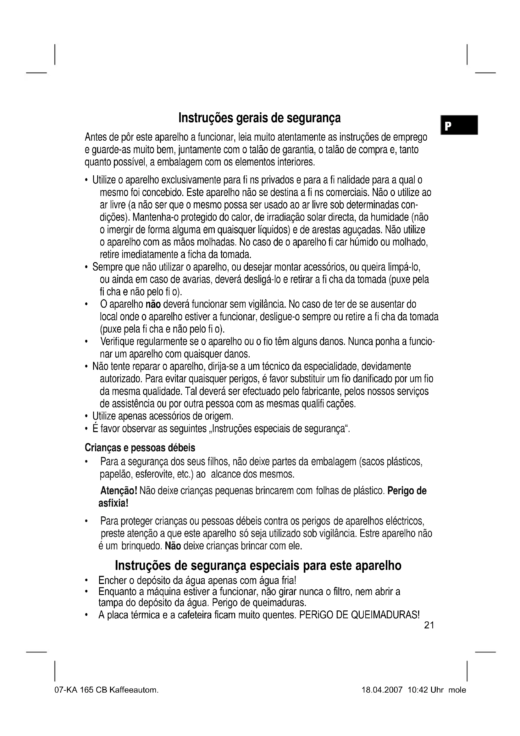 - É favor observar as seguintes „Instruções especiais de segurança“. 07-KA 165 CB Kaffeeautom. 18.04.2007 10:42 Uhr mole Crianças e pessoas débeis