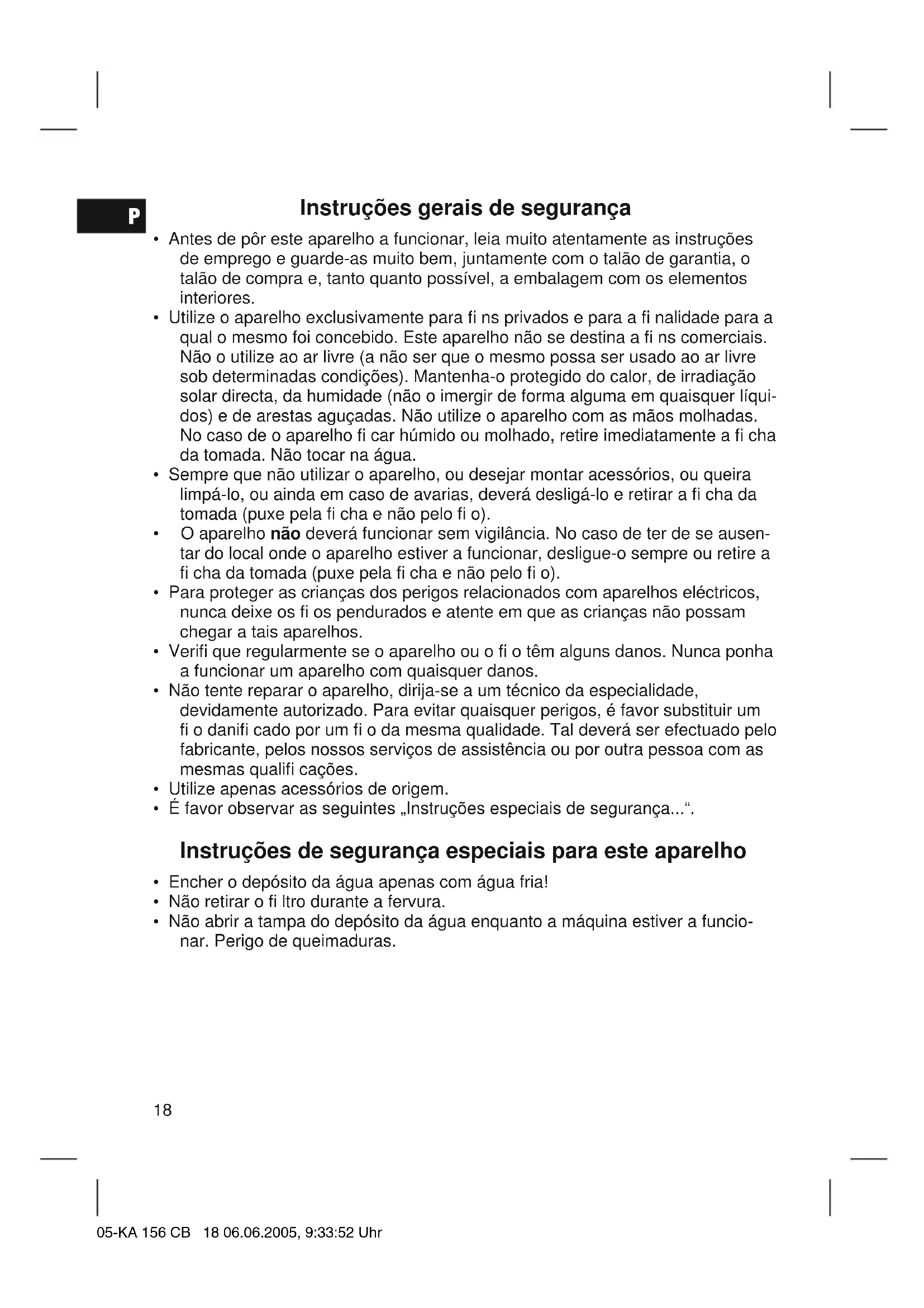- Não abrir a tampa do depósito da água enquanto a máquina estiver a funcio- nar. Perigo de queimaduras. 05-KA 156 CB 18 06.06.2005, 9:33:52 UhrP