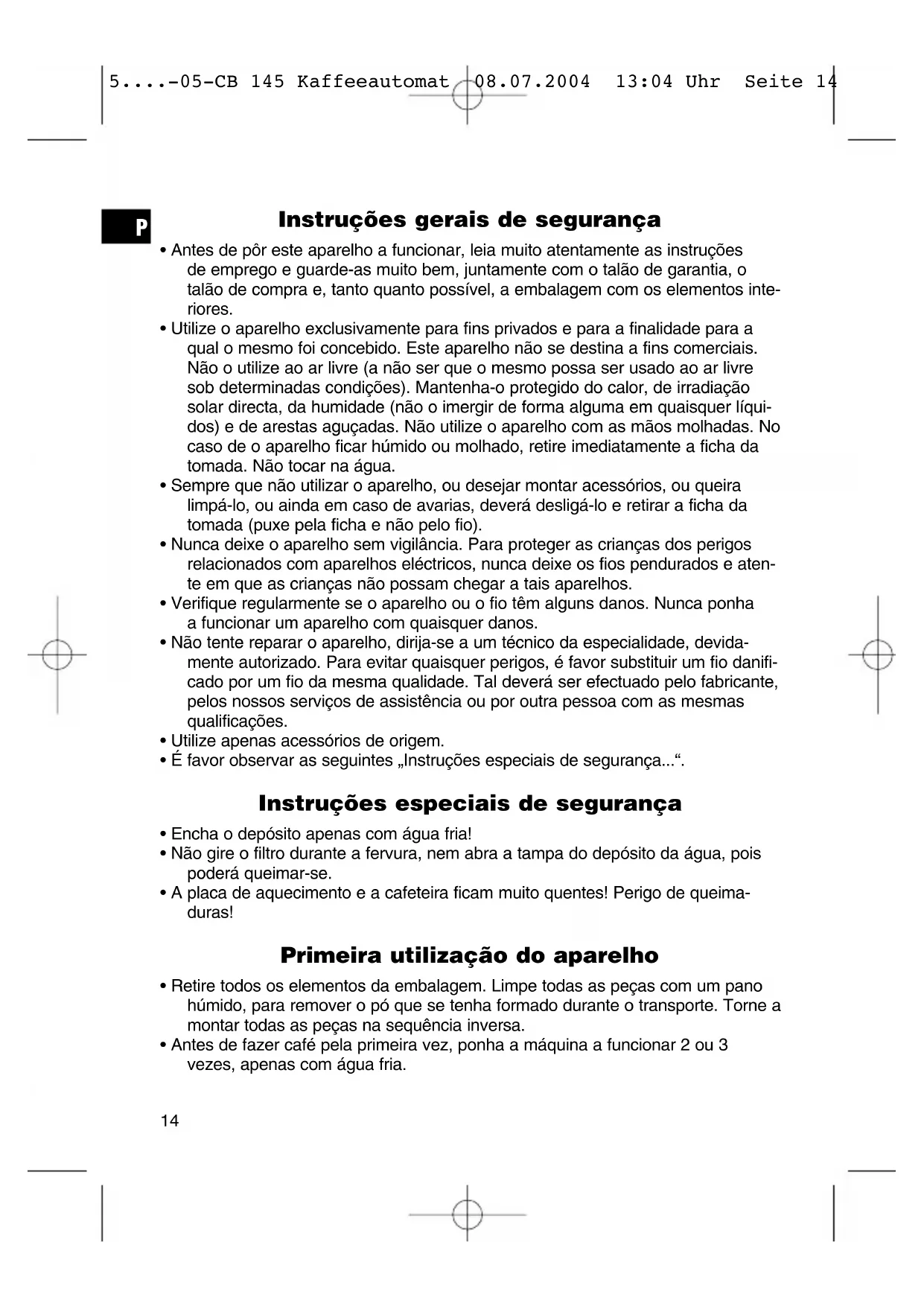 5....-05-CB 145 Kaffeeautomat 08.07.2004 13:04 Uhr Seite 154. Não imirja a cafeteira em água. Limpe a parte exterior com um pano húmido. O interior da cafeteira pode ser lavado com água quente e, se necessário, com uma escova macia. Este aparelho obedece às normas da CE para eliminação de interferências e segurança de baixa tensão e foi fabricado de acordo com os regulamentos mais recentes da técnica de segurança. Reserva-se o direito de alterações! Garantia O aparelho vendido pela nossa empresa tem uma garantia de 24 meses a partir da data da compra (talão). Durante o período de garantia, procederemos à remoção grátis - quer por repa- ração, quer por substituição - de todas as deficiências do aparelho que provenham de erros de material ou de fabricação. O talão de compra consistirá prova desta garantia. Sem o mesmo, não será pos- sível proceder-se a qualquer troca ou reparação grátis. No caso de querer fazer valer a garantia, é favor entregar o aparelho completo na embalagem original, juntamente com o talão de compra, na loja onde aquele tenha sido comprado. Em caso de danos em peças de vidro ou de defeitos em quaisquer acessórios, não será efectuada a substituição do aparelho. Os mesmos serão trocados e expe- didos gratuitamente. Não enviar neste caso o aparelho para a fábrica; bastará encomendar o acessório em questão! Não estão incluídas na garantia a limpeza, a manutenção ou a troca de peças que se desgastem, devendo tais despesas ser reembolsadas. A garantia deixará de ter validade, sempre que tenha havido intervenção alheia no aparelho. Após a garantia Após a expiração do prazo de garantia, poderão ser efectuados arranjos por pes- soal especializado, ou pelos nossos serviços de reparações, contra reembolso.