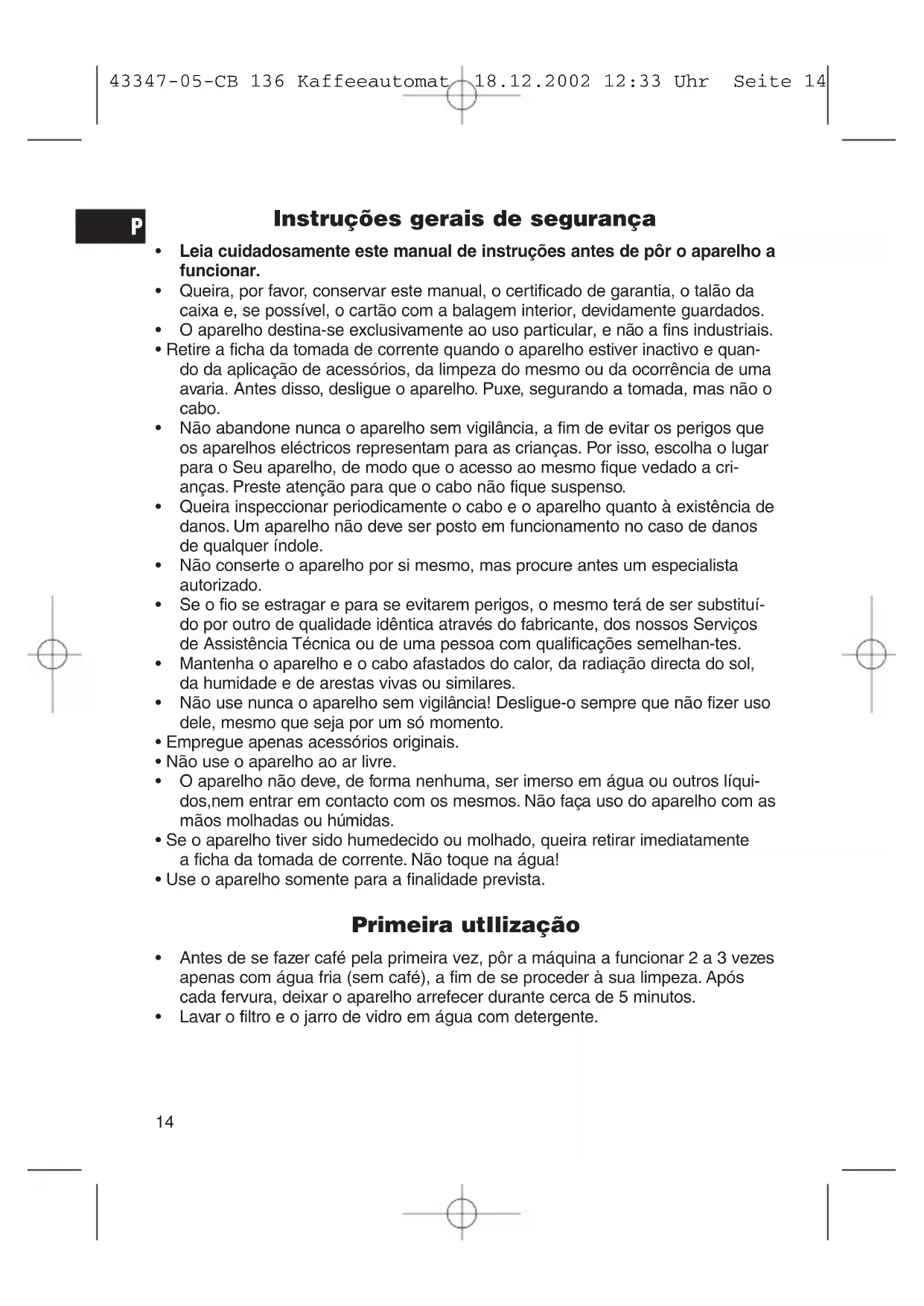 43347-05-CB 136 Kaffeeautomat 18.12.2002 12:33 Uhr Seite 15Limpeza Antes de se proceder à limpeza da máquina, retirar sempre o fio da tomada e esperar que o aparelho arrefeça. Limpar a máquina usando apenas um pano húmi- do.Para retirar o filtro da máquina, basta puxar pela presilha que se encontra no respectivo suporte. O jarro e o filtro são lavados normalmente em água com deter- gente para a louça. Este aparelho obedece às normas da CE para eliminação de interferências e segurança de baixa tensão e foi fabricado de acordo com os regulamentos mais recentes da técnica de segurança. Reserva-se o direito de alterações! Garantia O aparelho vendido pela nossa empresa tem uma garantia de 24 meses a partir da data da compra (talão). Durante o período de garantia, procederemos à remoção grátis - quer por repa- ração, quer por substituição - de todas as deficiências do aparelho que provenham de erros de material ou de fabricação. O talão de compra consistirá prova desta garantia. Sem o mesmo, não será pos- sível proceder-se a qualquer troca ou reparação grátis. No caso de querer fazer valer a garantia, é favor entregar o aparelho completo na embalagem original, juntamente com o talão de compra, na loja onde aquele tenha sido comprado. Em caso de danos em peças de vidro ou de defeitos em quaisquer acessórios, não será efectuada a substituição do aparelho. Os mesmos serão trocados e expe- didos gratuitamente. Não enviar neste caso o aparelho para a fábrica; bastará encomendar o acessório em questão! Não estão incluídas na garantia a limpeza, a manutenção ou a troca de peças que se desgastem, devendo tais despesas ser reembolsadas. A garantia deixará de ter validade, sempre que tenha havido intervenção alheia no aparelho. Após a garantia Após a expiração do prazo de garantia, poderão ser efectuados arranjos por pes- soal especializado, ou pelos nossos serviços de reparações, contra reembolso.
