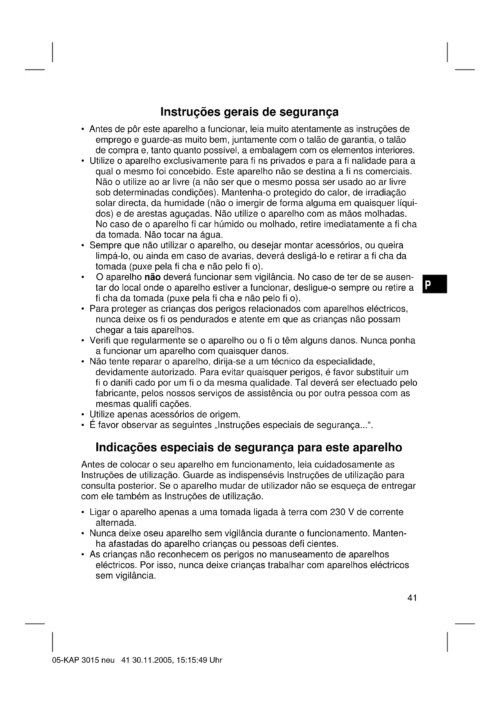 - As crianças não reconhecem os perigos no manuseamento de aparelhos eléctricos. Por isso, nunca deixe crianças trabalhar com aparelhos eléctricos sem vigilância. 05-KAP 3015 neu 41 30.11.2005, 15:15:49 UhrP