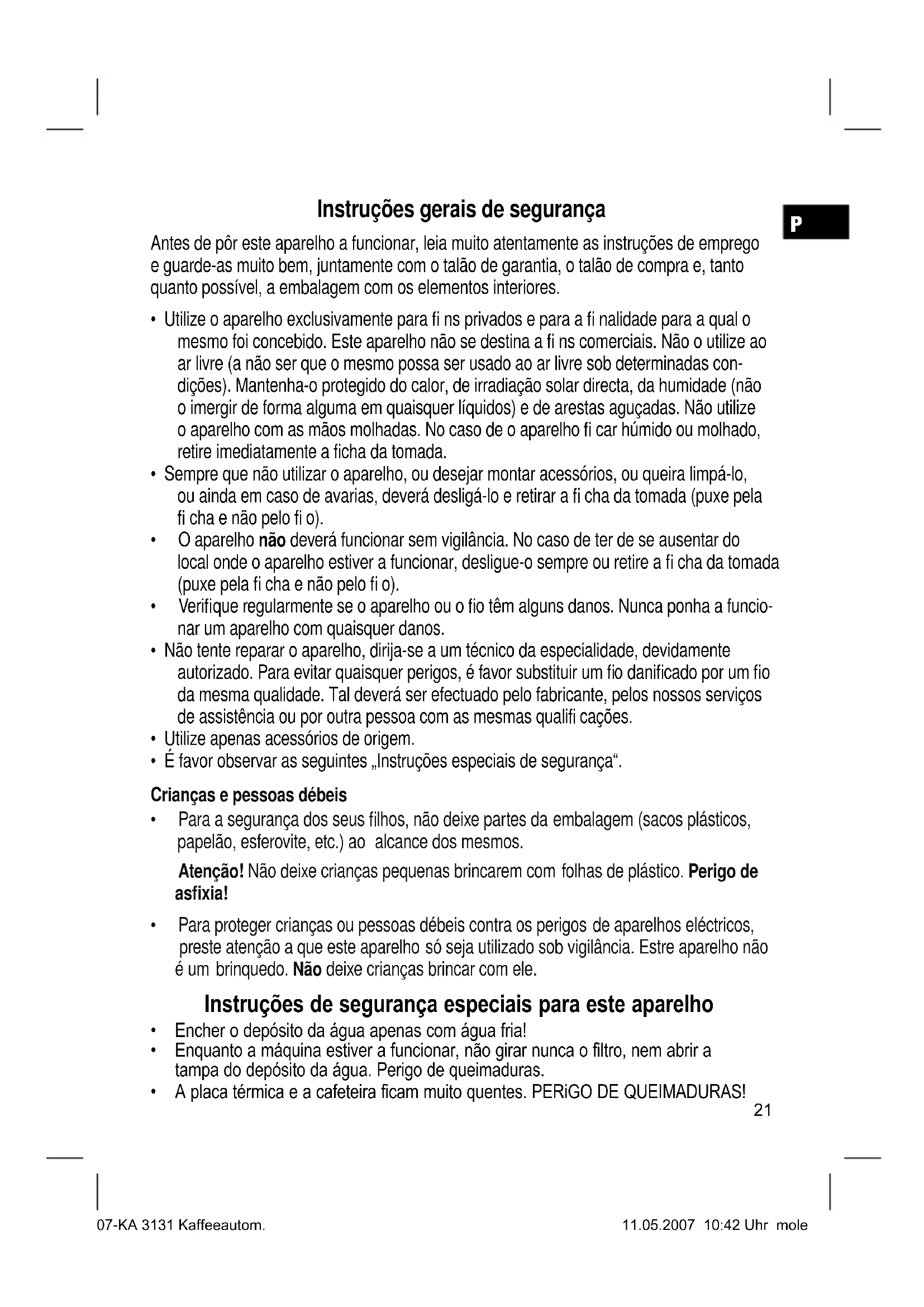 - É favor observar as seguintes „Instruções especiais de segurança“. 07-KA 3131 Kaffeeautom. 11.05.2007 10:42 Uhr mole Crianças e pessoas débeis