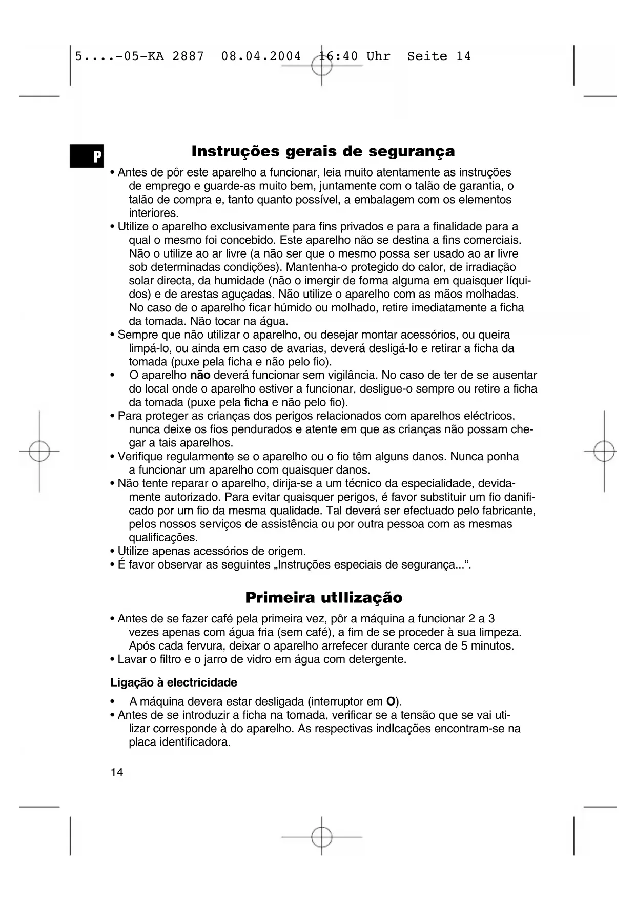 5....-05-KA 2887 08.04.2004 16:40 Uhr Seite 14• Ligar o aparelho apenas a uma tomada de 230 V, 50 Hz, com protecção de contacto, instalada devidamente. Preparação do café