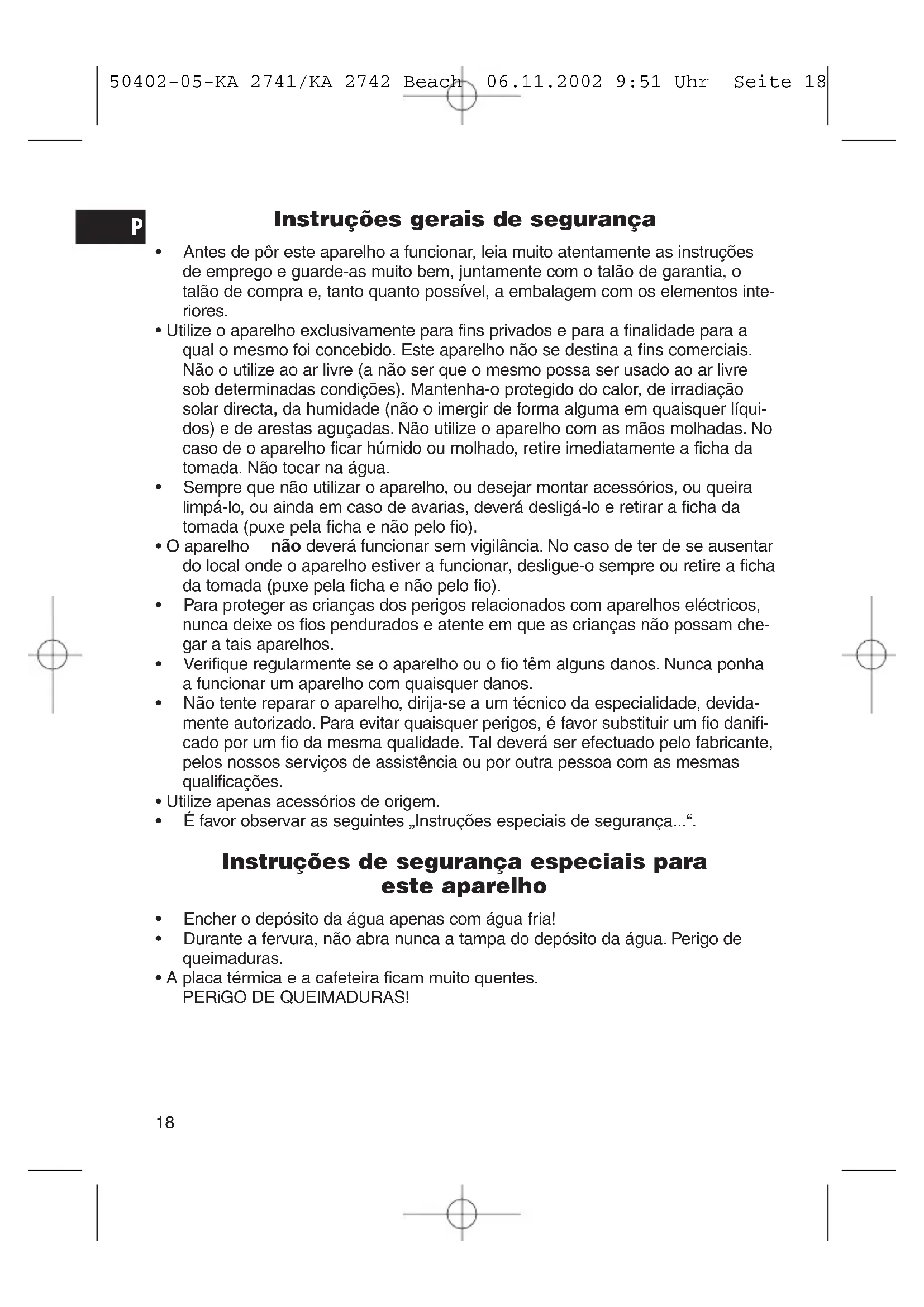 50402-05-KA 2741/KA 2742 Beach 06.11.2002 9:51 Uhr Seite 20Este aparelho foi controlado nos termos das actuais directivas da CEE aplicáveis, tais como inocuidade electromagnética e directiva sobre baixa tensão, e fabricado de acordo com as mais novas prescrições da segurança técnica. Reserva-se o direito de alterações! Garantia O aparelho vendido pela nossa empresa tem uma garantia de 24 meses a partir da data da compra (talão). Durante o período de garantia, procederemos à remoção grátis - por reparação, ou, segundo a nossa decisão, por substituição - das deficiências do aparelho ou dos acessórios*) que provenham de erros de material ou de fabricação. A pre- stação de serviços relacionados com a garantia não prolongarão a mesma, nem iniciarão um novo prazo de garantia! O talão de compra consistirá prova desta garantia. Sem o mesmo, não será pos- sível proceder-se a qualquer troca ou reparação grátis. Em caso de garantia, entregue o aparelho completo, juntamente com o talão de compra, na loja onde o mesmo foi comprado. *) No caso de danos em quaisquer acessórios, não será efectuada automática- mente uma substituição completa do aparelho. Contacte neste caso a nossa hotli- ne! Danos causados por quebras de peças de vidro ou de plástico terão de ser pagos pelo cliente! Não estão incluídos na garantia quaisquer defeitos de acessórios ou de peças que se desgastem (como, por exemplo, carvões do motor, varinhas, correias do motor, telecomandos, escovas de dentes, folhas de serra, etc.), nem a limpeza, a manu- tenção ou a substituição de peças que se desgastem, devendo tais despesas ser reembolsadas! A garantia terminará sempre que tenha havido intervenção alheia nos aparelhos. Após a garantia Após a expiração do prazo de garantia, poderão ser efectuados arranjos por pes- soal especializado, ou pelos nossos serviços de reparações, contra reembolso.