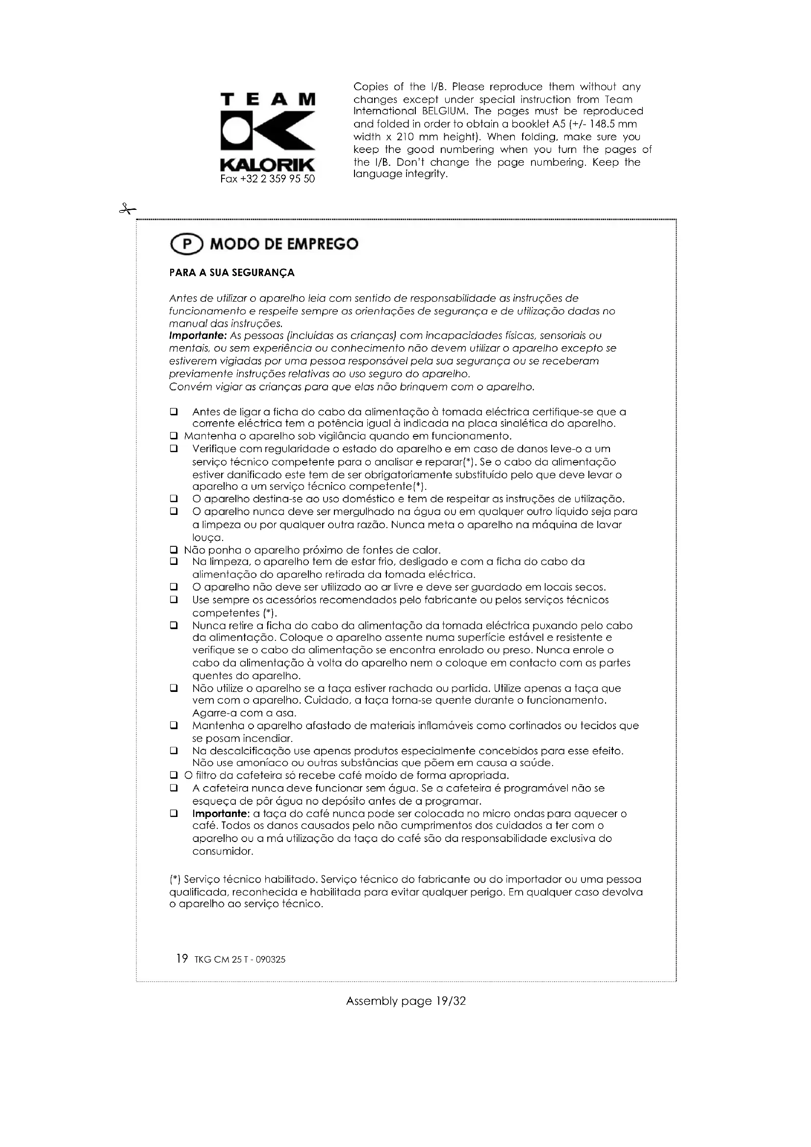 Antes de utilizar o aparelho leia com sentido de responsabilidade as instruções de funcionamento e respeite sempre as orientações de segurança e de utilização dadas no manual das instruções. Importante: As pessoas (incluídas as crianças) com incapacidades físicas, sensoriais ou mentais, ou sem experiência ou conhecimento não devem utilizar o aparelho excepto se estiverem vigiadas por uma pessoa responsável pela sua segurança ou se receberam previamente instruções relativas ao uso seguro do aparelho. Convém vigiar as crianças para que elas não brinquem com o aparelho. Antes de ligar a ficha do cabo da alimentação à tomada eléctrica certifique-se que a corrente eléctrica tem a potência igual à indicada na placa sinalética do aparelho. Mantenha o aparelho sob vigilância quando em funcionamento. Verifique com regularidade o estado do aparelho e em caso de danos leve-o a um serviço técnico competente para o analisar e reparar(*). Se o cabo da alimentação estiver danificado este tem de ser obrigatoriamente substituído pelo que deve levar o aparelho a um serviço técnico competente(*). O aparelho destina-se ao uso doméstico e tem de respeitar as instruções de utilização. O aparelho nunca deve ser mergulhado na água ou em qualquer outro líquido seja para a limpeza ou por qualquer outra razão. Nunca meta o aparelho na máquina de lavar louça. Não ponha o aparelho próximo de fontes de calor. Na limpeza, o aparelho tem de estar frio, desligado e com a ficha do cabo da alimentação do aparelho retirada da tomada eléctrica. O aparelho não deve ser utilizado ao ar livre e deve ser guardado em locais secos. Use sempre os acessórios recomendados pelo fabricante ou pelos serviços técnicos competentes (*). Nunca retire a ficha do cabo da alimentação da tomada eléctrica puxando pelo cabo da alimentação. Coloque o aparelho assente numa superfície estável e resistente e verifique se o cabo da alimentação se encontra enrolado ou preso. Nunca enrole o cabo da alimentação à volta do aparelho nem o coloque em contacto com as partes quentes do aparelho. Não utilize o aparelho se a taça estiver rachada ou partida. Utilize apenas a taça que vem com o aparelho. Cuidado, a taça torna-se quente durante o funcionamento. Agarre-a com a asa. Mantenha o aparelho afastado de materiais inflamáveis como cortinados ou tecidos que se posam incendiar. Na descalcificação use apenas produtos especialmente concebidos para esse efeito. Não use amoníaco ou outras substâncias que põem em causa a saúde. O filtro da cafeteira só recebe café moído de forma apropriada. A cafeteira nunca deve funcionar sem água. Se a cafeteira é programável não se esqueça de pôr água no depósito antes de a programar. Importante: a taça do café nunca pode ser colocada no micro ondas para aquecer o café. Todos os danos causados pelo não cumprimentos dos cuidados a ter com o aparelho ou a má utilização da taça do café são da responsabilidade exclusiva do consumidor. (*) Serviço técnico habilitado. Serviço técnico do fabricante ou do importador ou uma pessoa qualificada, reconhecida e habilitada para evitar qualquer perigo. Em qualquer caso devolva o aparelho ao serviço técnico. Copies of the I/B. Please reproduce them without any changes except under special instruction from Team International BELGIUM. The pages must be reproduced and folded in order to obtain a booklet A5 (+/- 148.5 mm width x 210 mm height). When folding, make sure you keep the good numbering when you turn the pages of the I/B. Don’t change the page numbering. Keep the language integrity.
