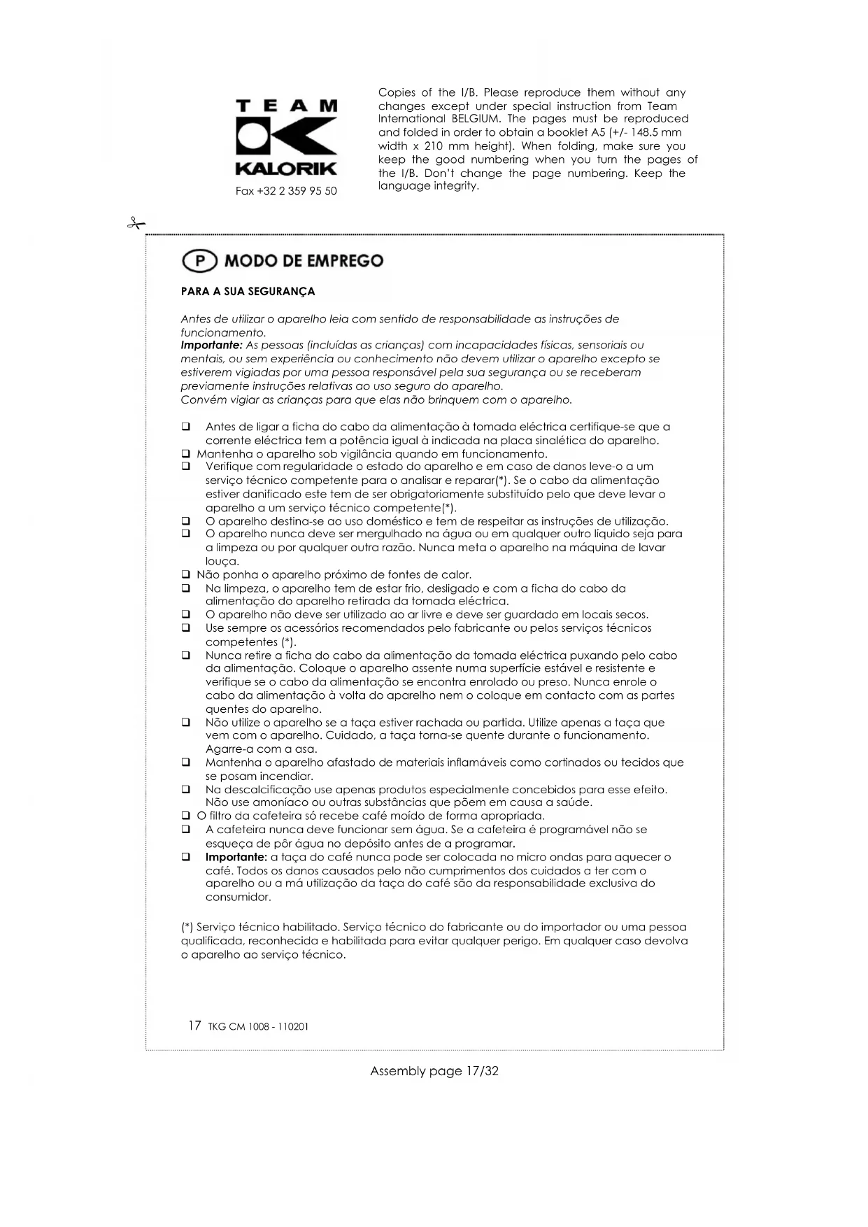 Antes de qualquer limpeza, coloque o interruptor na posição off/desliada,retire a ficha do cabo da alimentação da tomada eléctrica e deixe arrefecer a máquina de café. O filtro de papel, o filtro de plástico, a taça de vidro, a tampa da taça de vidro podem ser limpas com uma solução de água quente ou em sabonária. O corpo da máquina de café pode ser limpo com um pano macio e húmido. Nunca mergulhe o corpo da máquina de café em água ou em outros líquidos. Nunca utilize na limpeza produtos abrasivos ou solventes. Ao descalcificar a máquina de café prolonga-lhe a vida útil da mesma. Na descalcificação utilize descalcificantes apropriados para as máquinas de café. Nunca ponha a taça de vidro na máquina de lavar a loiça. Caso a dureza da água na sua região seja muito dura deve efectuar a descalcificação da máquina por cada 7 ou 10 vezes de utilização como passamos a descrever: Coloque 3 chávenas do descalcificante no depósito da água e encha-o com água até ao nivel máximo. Coloque a taça de vidro por baixo da saída do café. Coloque a ficha do cabo da alimentação na tomada eléctrica e prima o botão “power“ Quando o reservatório da água ficar vazio e a taça de vidro cheia coloque o interruptor na posição off-desligada. Copies of the I/B. Please reproduce them without any changes except under special instruction from Team International BELGIUM. The pages must be reproduced and folded in order to obtain a booklet A5 (+/- 148.5 mm width x 210 mm height). When folding, make sure you keep the good numbering when you turn the pages of the I/B. Don’t change the page numbering. Keep the language integrity.