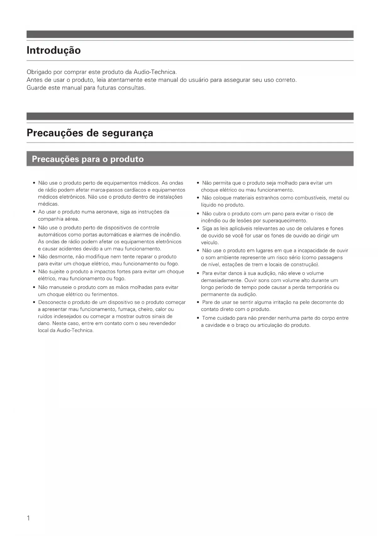 - Android es una marca comercial de Google Inc. ATH-AR3BT_UM_V2_10L_book.indb 16 2017/02/10 9:221 Obrigado por comprar este produto da Audio-Technica. Antes de usar o produto, leia atentamente este manual do usuário para assegurar seu uso correto. Guarde este manual para futuras consultas. Introdução Precauções de segurança Precauções para o produto