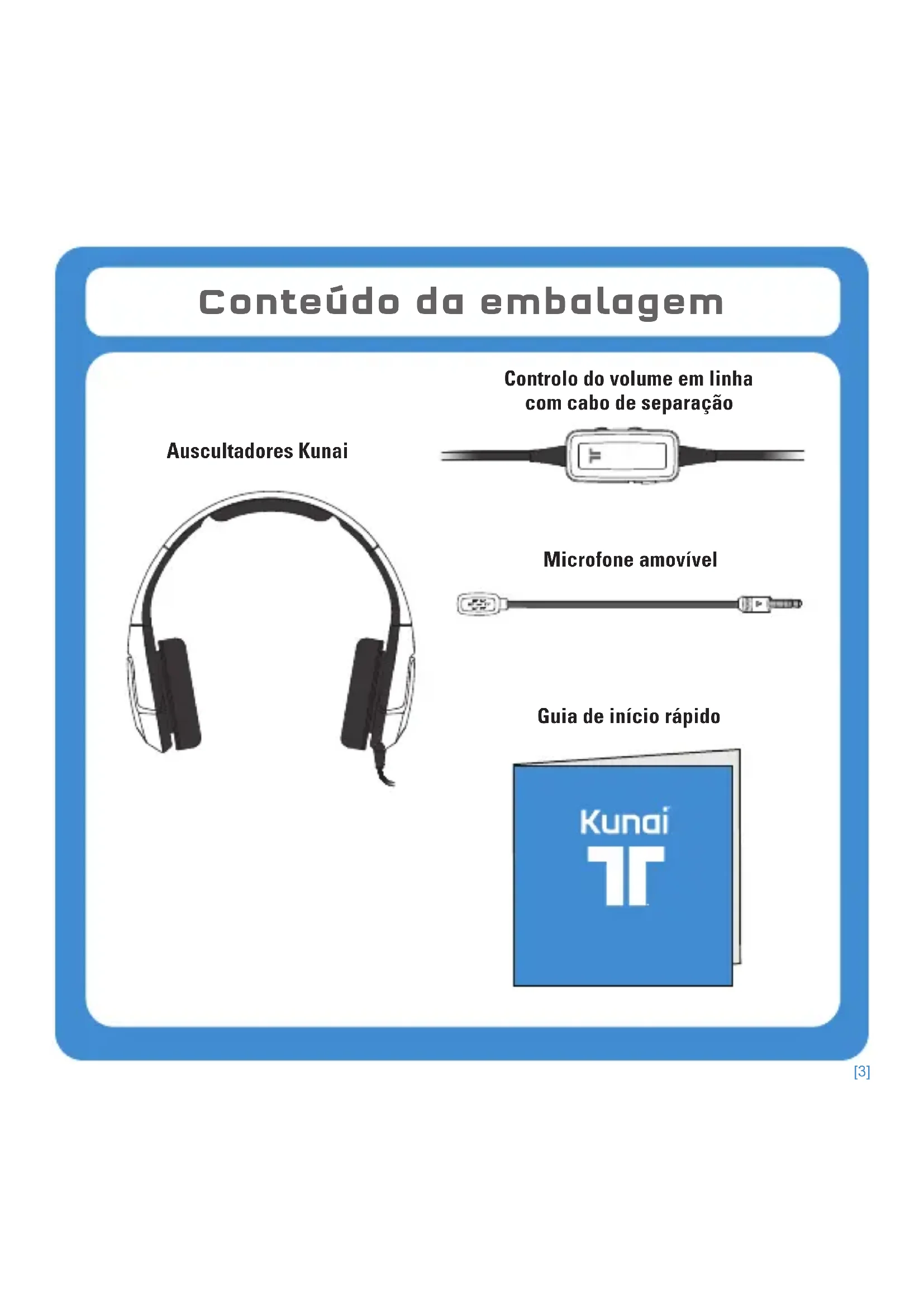- Suporte Técnico Conteúdo[3] Conteúdo da embalagem Guia de início rápido Auscultadores Kunai Controlo do volume em linha com cabo de separação Microfone amovível[4] Ligar o microfone p. 13