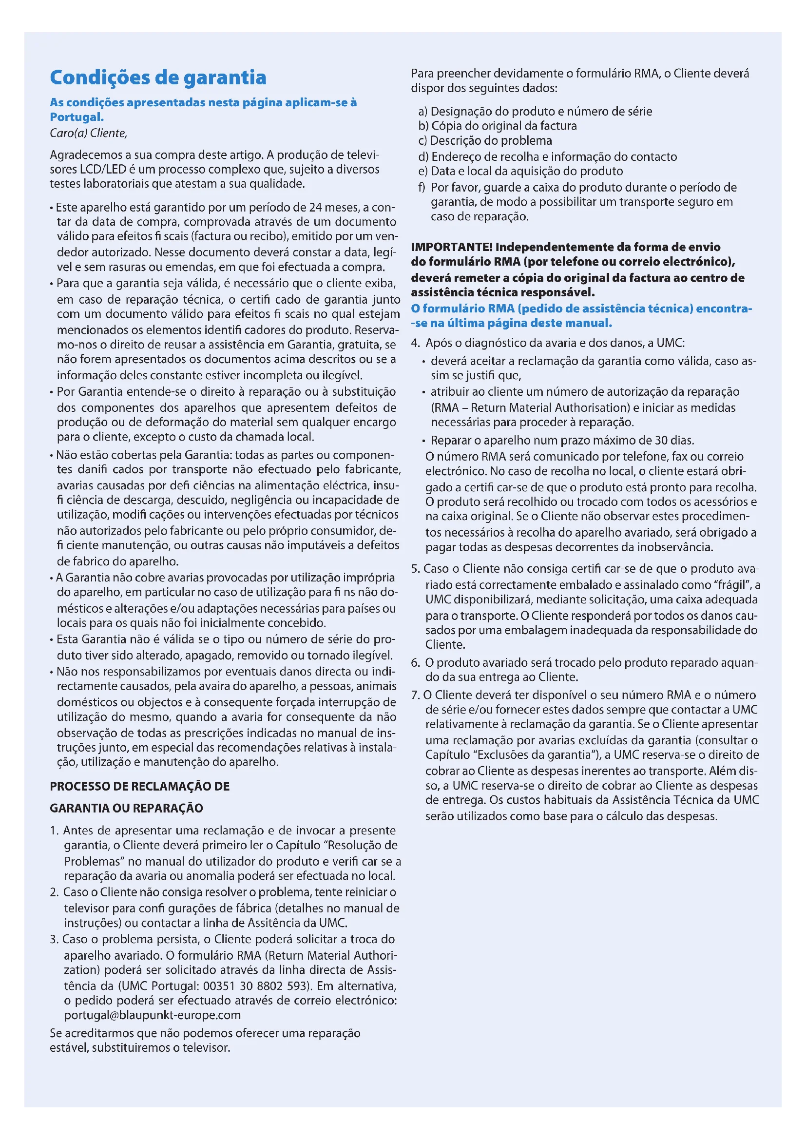 aparelho avariado. O formulário RMA (Return Material Authori- zation) poderá ser solicitado através da linha directa de Assis- tência da (UMC Portugal: 00351 30 8802 593). Em alternativa, o pedido poderá ser efectuado através de correio electrónico: portugal@blaupunkt-europe.com Se acreditarmos que não podemos oferecer uma reparação estável, substituiremos o televisor. Para preencher devidamente o formulário RMA, o Cliente deverá dispor dos seguintes dados: a) Designação do produto e número de série b) Cópia do original da factura c) Descrição do problema d) Endereço de recolha e informação do contacto e) Data e local da aquisição do produto f) Por favor, guarde a caixa do produto durante o período de garantia, de modo a possibilitar um transporte seguro em caso de reparação. IMPORTANTE! Independentemente da forma de envio do formulário RMA (por telefone ou correio electrónico), deverá remeter a cópia do original da factura ao centro de assistência técnica responsável. O formulário RMA (pedido de assistência técnica) encontra- -se na última página dest e manual.