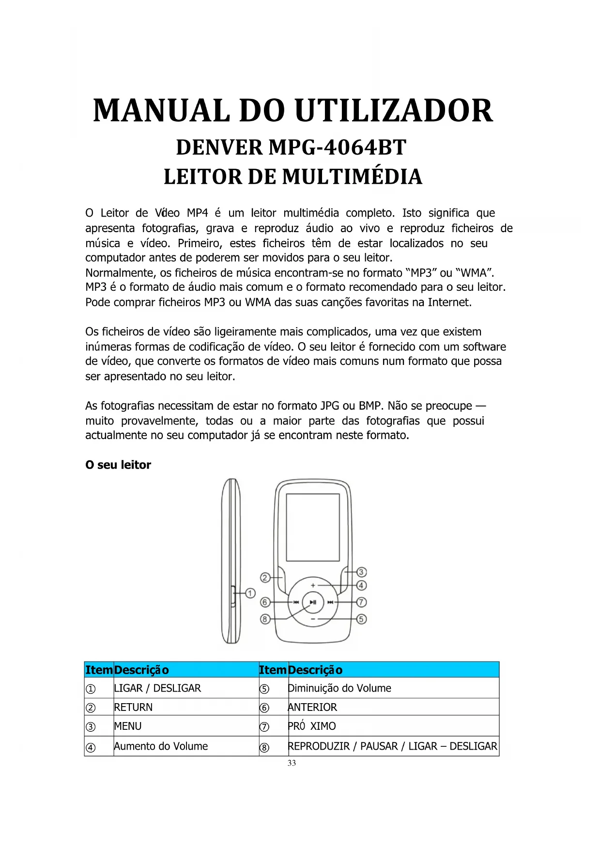 MPG4064BT - Leitor mp3 DENVER - Manual de utilização gratuito