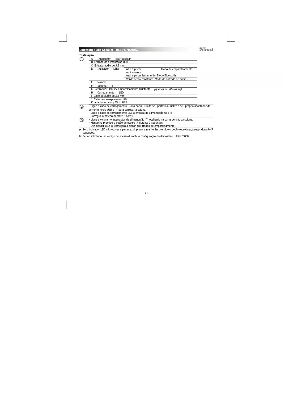 - Ligue o cabo de carregamento USB à porta USB do seu portátil ou utilize o seu próprio adaptador de corrente micro USB e ‘K’ para carregar a coluna. - Ligue o cabo de carregamento USB à entrada de alimentação USB ‘B’. - Carregue a bateria durante 3 horas. - Ligue a coluna no interruptor de alimentação ‘A’ localizado na parte de trás da coluna. - Mantenha premido o botão de espera ‘J’ durante 3 segundos. - O indicador LED ‘D’ começará a piscar azul (modo de emparelhamento). Se o indicador LED não estiver a piscar azul, prima e mantenha premido o botão reproduzir/pausar durante 5 segundos. Se for solicitado um código de acesso durante a configuração do dispositivo, utilize ‘0000’.