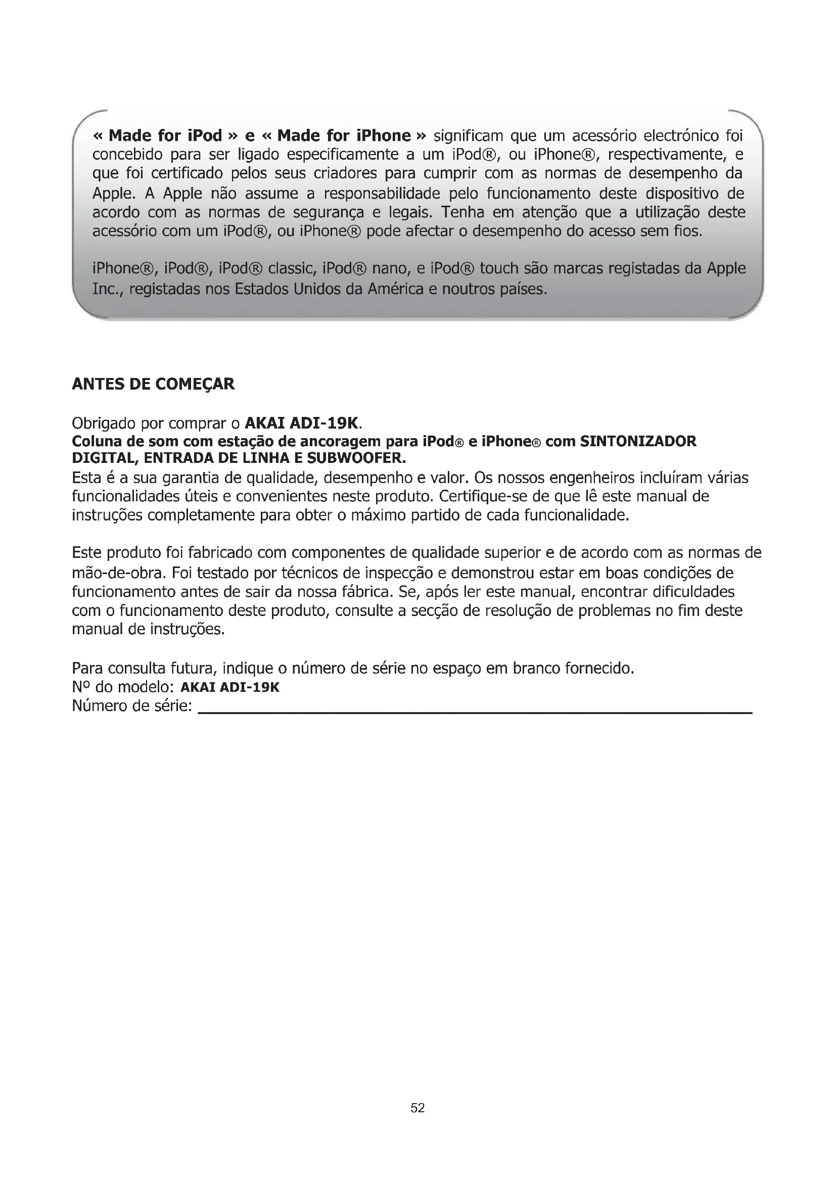 Obrigado por comprar o AKAI ADI-19K. Coluna de som com estação de ancoragem para iPod® e iPhone® com SINTONIZADOR DIGITAL, ENTRADA DE LINHA E SUBWOOFER.