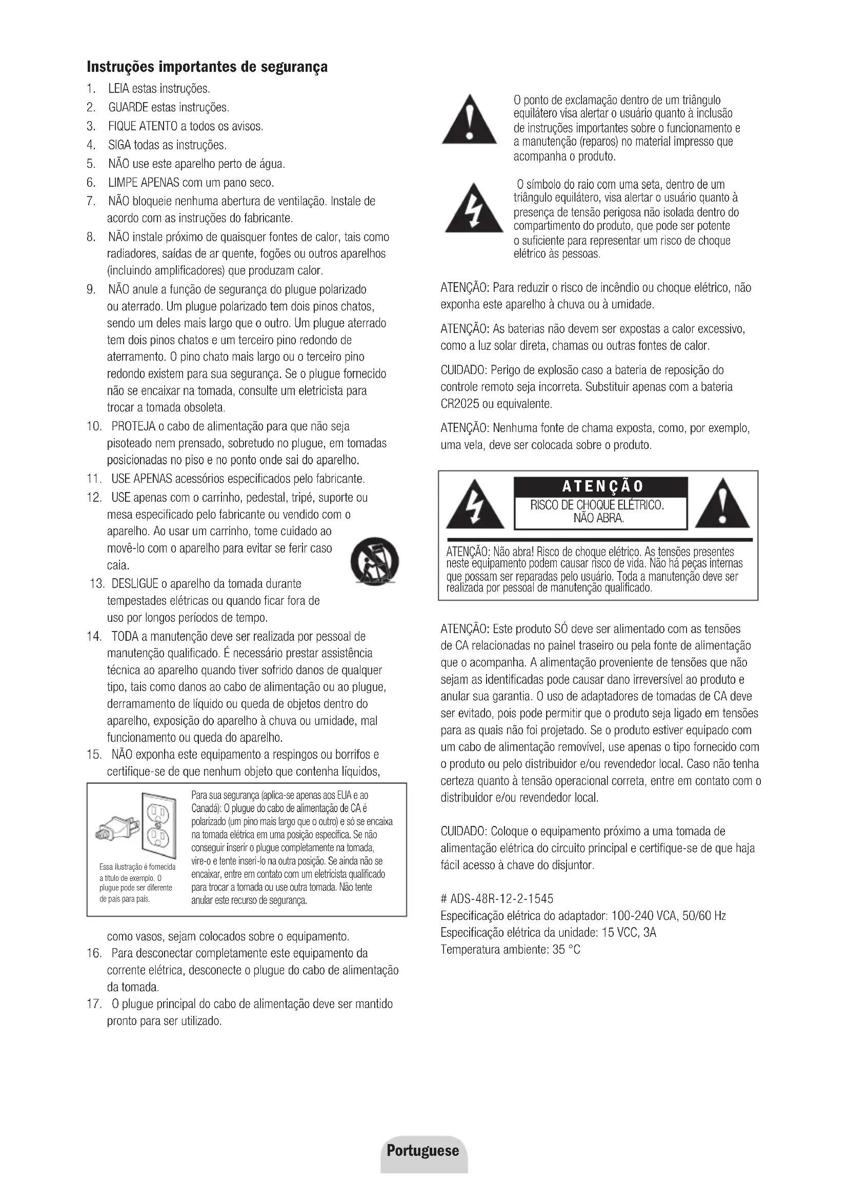 ou aterrado. Um plugue polarizado tem dois pinos chatos, sendo um deles mais largo que o outro. Um plugue aterrado tem dois pinos chatos e um terceiro pino redondo de aterramento. O pino chato mais largo ou o terceiro pino redondo existem para sua segurança. Se o plugue fornecido não se encaixar na tomada, consulte um eletricista para trocar a tomada obsoleta.