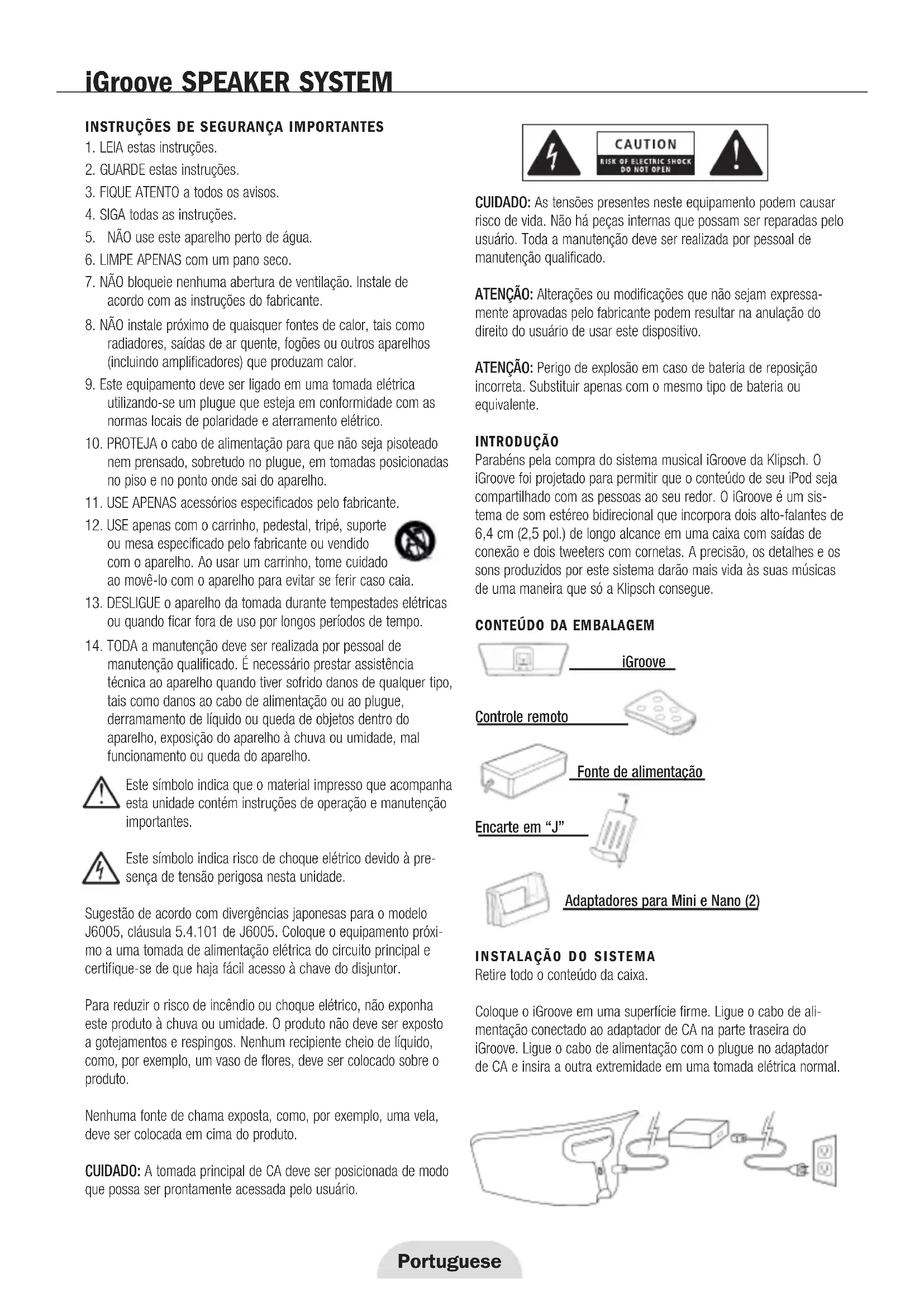 manutenção qualificado. É necessário prestar assistência técnica ao aparelho quando tiver sofrido danos de qualquer tipo, tais como danos ao cabo de alimentação ou ao plugue, derramamento de líquido ou queda de objetos dentro do aparelho, exposição do aparelho à chuva ou umidade, mal funcionamento ou queda do aparelho. Este símbolo indica que o material impresso que acompanha esta unidade contém instruções de operação e manutenção importantes. Este símbolo indica risco de choque elétrico devido à pre- sença de tensão perigosa nesta unidade. Sugestão de acordo com divergências japonesas para o modelo J6005, cláusula 5.4.101 de J6005. Coloque o equipamento próxi- mo a uma tomada de alimentação elétrica do circuito principal e certifique-se de que haja fácil acesso à chave do disjuntor. Para reduzir o risco de incêndio ou choque elétrico, não exponha este produto à chuva ou umidade. O produto não deve ser exposto a gotejamentos e respingos. Nenhum recipiente cheio de líquido, como, por exemplo, um vaso de flores, deve ser colocado sobre o produto. Nenhuma fonte de chama exposta, como, por exemplo, uma vela, deve ser colocada em cima do produto. CUIDADO: A tomada principal de CA deve ser posicionada de modo que possa ser prontamente acessada pelo usuário. CUIDADO: As tensões presentes neste equipamento podem causar risco de vida. Não há peças internas que possam ser reparadas pelo usuário. Toda a manutenção deve ser realizada por pessoal de manutenção qualificado. ATENÇÃO: Alterações ou modificações que não sejam expressa- mente aprovadas pelo fabricante podem resultar na anulação do direito do usuário de usar este dispositivo. ATENÇÃO: Perigo de explosão em caso de bateria de reposição incorreta. Substituir apenas com o mesmo tipo de bateria ou equivalente. INTRODUÇÃO Parabéns pela compra do sistema musical iGroove da Klipsch. O iGroove foi projetado para permitir que o conteúdo de seu iPod seja compartilhado com as pessoas ao seu redor. O iGroove é um sis- tema de som estéreo bidirecional que incorpora dois alto-falantes de 6,4 cm (2,5 pol.) de longo alcance em uma caixa com saídas de conexão e dois tweeters com cornetas. A precisão, os detalhes e os sons produzidos por este sistema darão mais vida às suas músicas de uma maneira que só a Klipsch consegue.