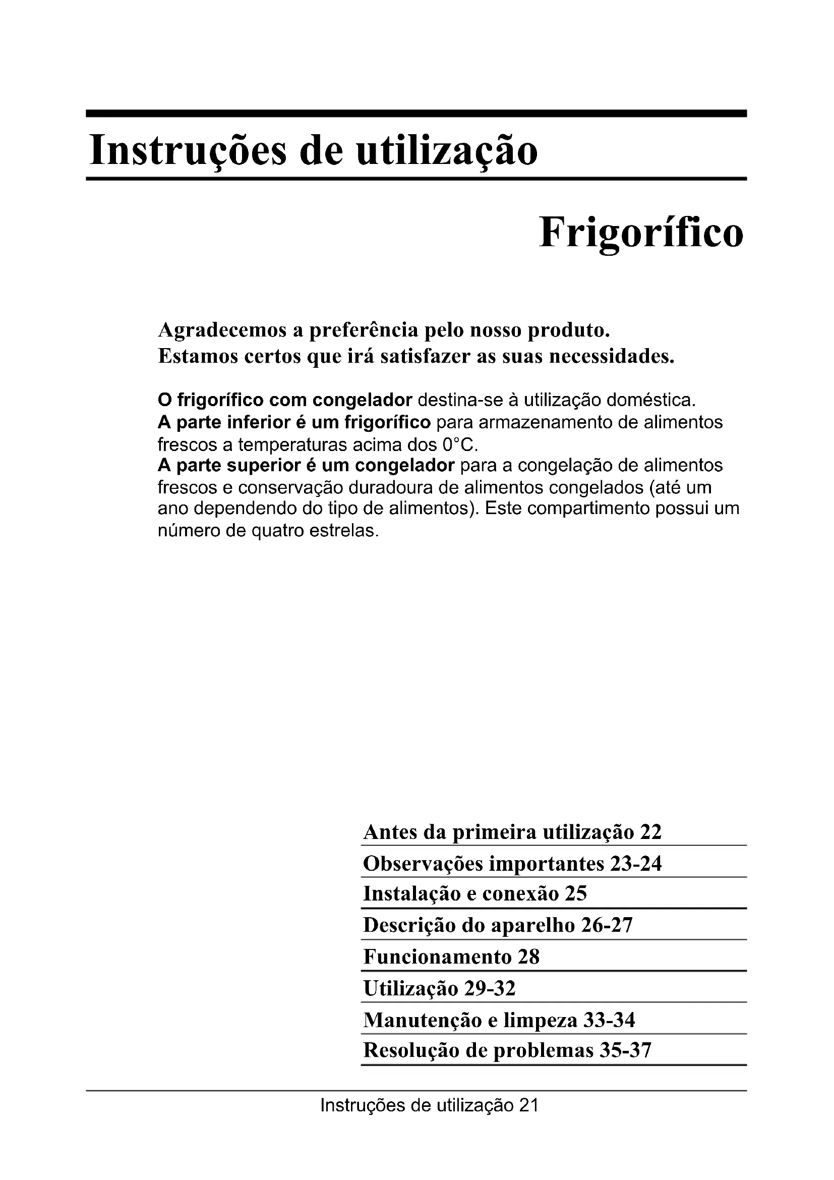 DEL APARATO.Instruções de utilização 21 Instruções de utilização Frigorífico Agradecemos a preferência pelo nosso produto. Estamos certos que irá satisfazer as suas necessidades. O frigorífico com congelador destina-se à utilização doméstica. A parte inferior é um frigorífico para armazenamento de alimentos frescos a temperaturas acima dos 0°C. A parte superior é um congelador para a congelação de alimentos frescos e conservação duradoura de alimentos congelados (até um ano dependendo do tipo de alimentos). Este compartimento possui um número de quatro estrelas. Antes da primeira utilização 22 Observações importantes 23-24 Instalação e conexão 25 Descrição do aparelho 26-27 Funcionamento 28 Utilização 29-32 Manutenção e limpeza 33-34 Resolução de problemas 35-37Instruções de utilização22 Antes da primeira utilização