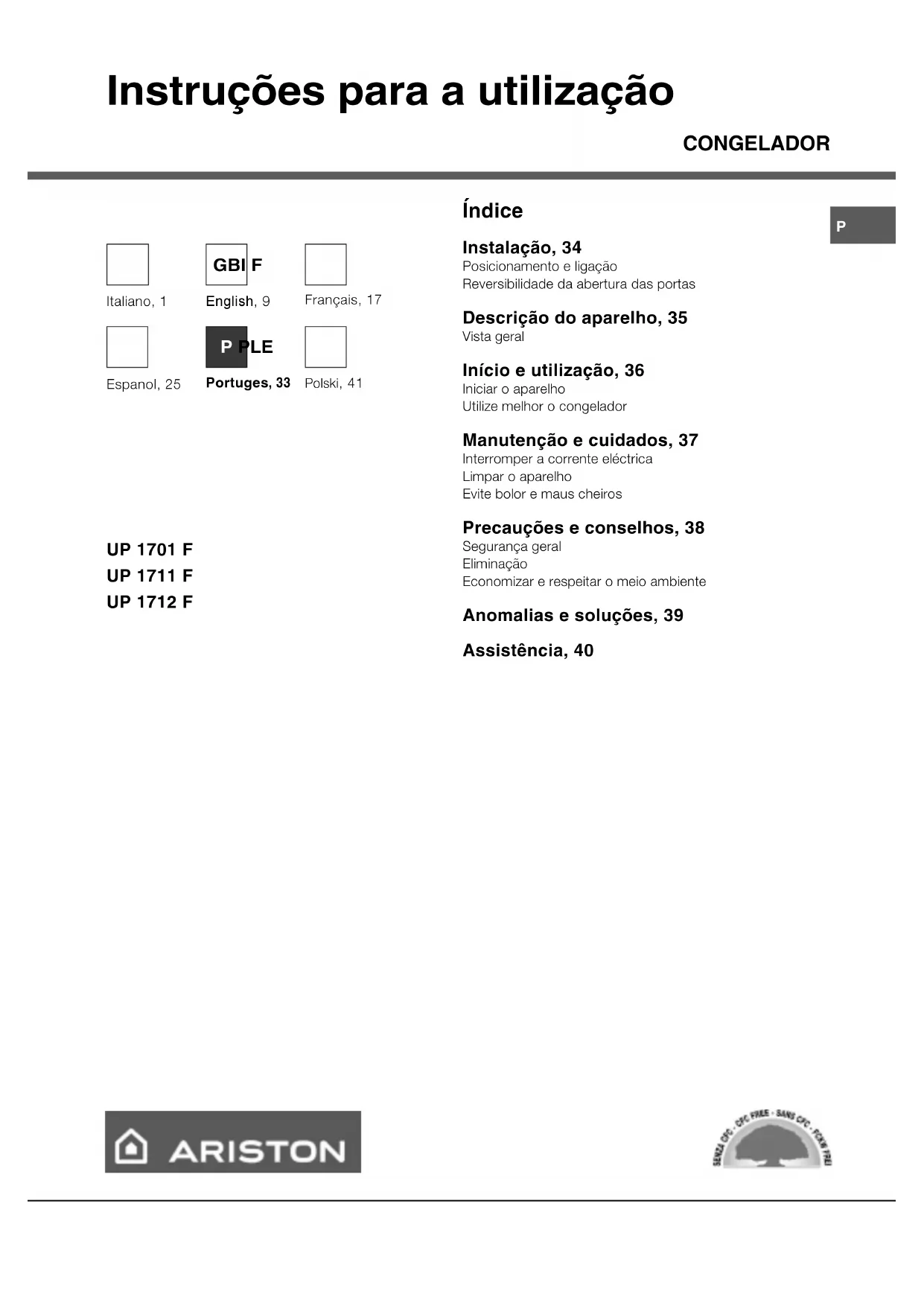 Encontre gratuitamente o manual do aparelho UP1701F Ariston Thermo em formato PDF.