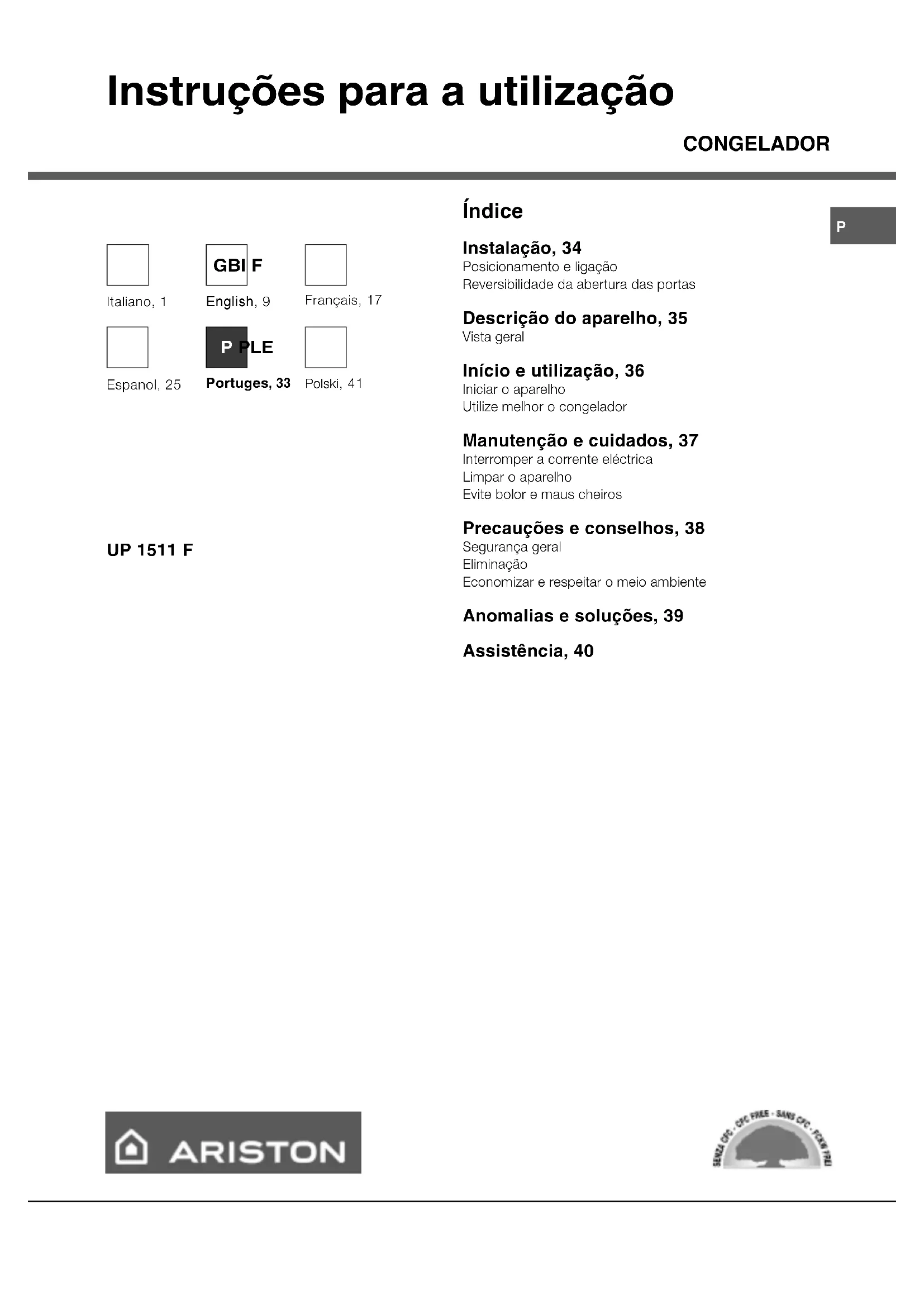 Asistencia Antes de llamar a la Asistencia: Verifique si la anomalía puede ser resuelta autónomamente (ver Anomalías y Soluciones). Se, apesar de todos os controlos, o aparelho não funcionar e a anomalia que notou continuar a verificar-se, chamar o Centro de Assistência Técnica mais próximo. Comunique: el tipo de anomalía el modelo de la máquina (Mod.) el número de serie (S/N) Esta información se encuentra en la placa de características ubicada en el compartimiento refrigerador abajo a la izquierda. Nunca recorrer a técnicos não autorizados e recusar sempre a instalação de peças sobresselentes não originais. modelo número de serieP Instruções para a utilização CONGELADOR Índice Instalação, 34 Posicionamento e ligação Reversibilidade da abertura das portas Descrição do aparelho, 35 Vista geral Início e utilização, 36 Iniciar o aparelho Utilize melhor o congelador Manutenção e cuidados, 37 Interromper a corrente eléctrica Limpar o aparelho Evite bolor e maus cheiros Precauções e conselhos, 38 Segurança geral Eliminação Economizar e respeitar o meio ambiente Anomalias e soluções, 39 Assistência, 40 UP 1511 F Italiano, 1 Français, 17 English, 9 GBI F Portuges , 33 Polski, 41 Espanol, 25 P PLE34
