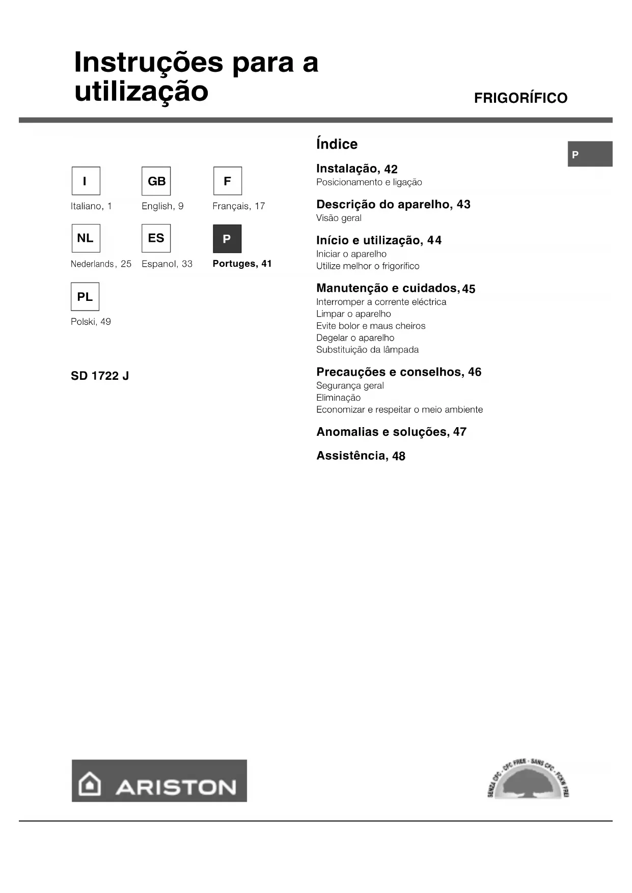 Encontre gratuitamente o manual do aparelho SD1722J Ariston Thermo em formato PDF.
