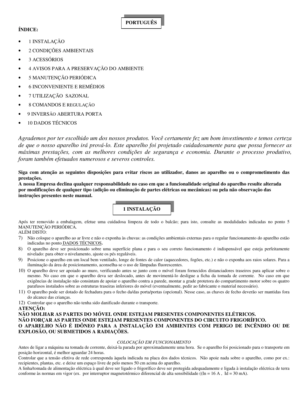 ATENÇÃO: NÃO MOLHAR AS PARTES DO MÓVEL ONDE ESTEJAM PRESENTES COMPONENTES ELÉTRICOS. NÃO FORÇAR AS PARTES ONDE ESTEJAM PRESENTES COMPONENTES DO CIRCUITO FRIGORÍFICO. O APARELHO NÃO É IDÔNEO PARA A INSTALAÇÃO EM AMBIENTES COM PERIGO DE INCÊNDIO OU DE EXPLOSÃO, OU SUBMETIDOS A RADIAÇÕES.