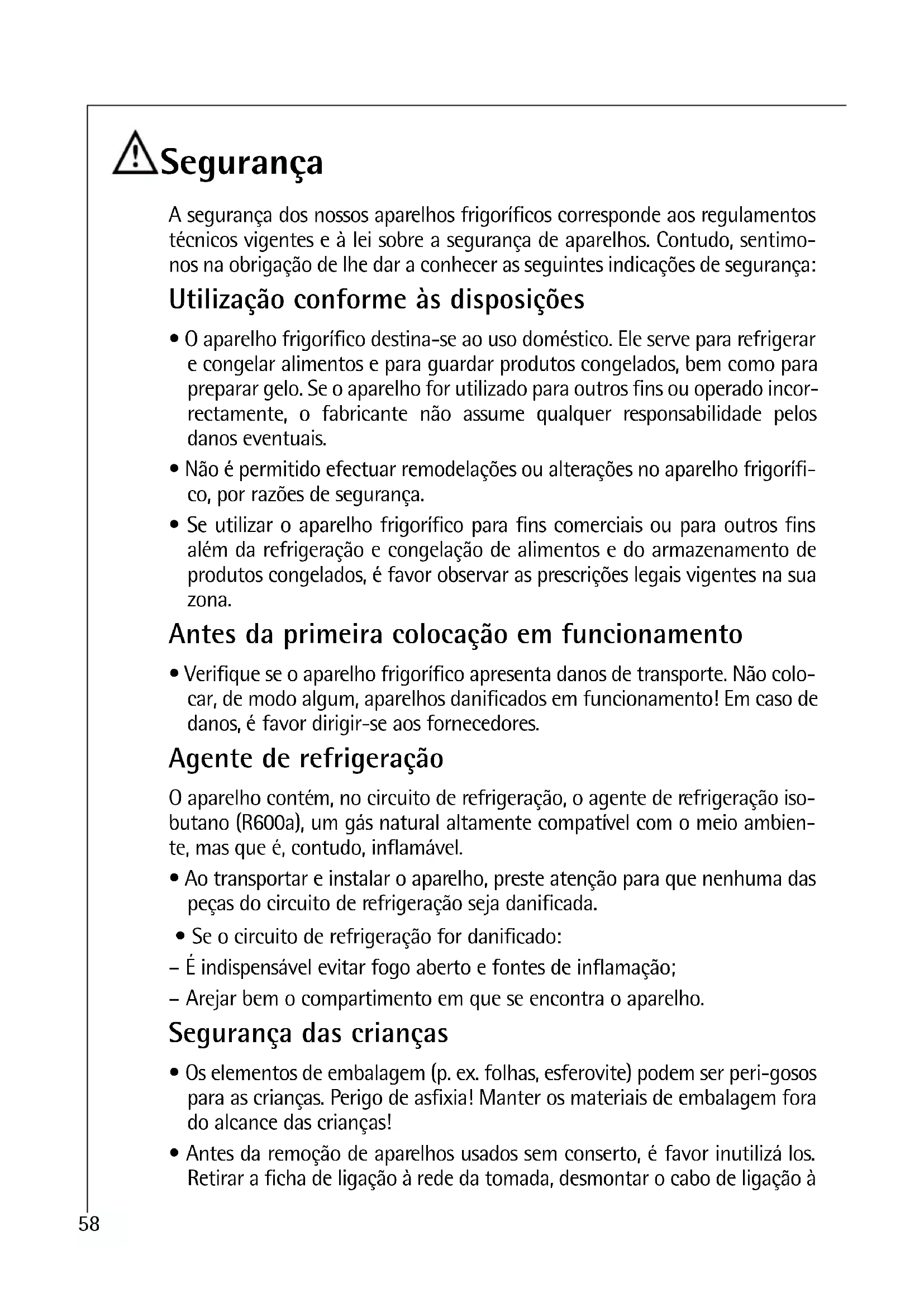 - Condensor De condensor heeft meestal de vorm van een rooster. In de conden- sor wordt het koelmiddel dat door de compressor verdicht is, gecon- denseerd. Hierbij komt warmte vrij die door de oppervlakte van de condensor aan de omgevingslucht afgegeven wordt. De condensor is daarom aan de buitenkant, meestal aan de achterkant van het appa- raat, aangebracht. Voor België: U kan onderdelen, toebehoren en verbruiksprodukten online bestellen op adres http://www.aeg.be Voor het online bestellen van onderdelen en accessoires, kijk op http://www.aeg.nl56 Estimado(a) Cliente Antes de colocar o seu novo aparelho em funcionamento, leia atenta- mente este manual de utilização. Nele pode encontrar informações importantes sobre a segurança de utilização, instalação e manutenção- do aparelho. Conserve-o de forma a poder consultá-lo sempre que necessário. Entregue-o a um eventual novo proprietário do aparelho. Este manual aplica-se a vários modelos tecnicamente comparáveis, que diferem apenas no equipamento. Observe apenas as indicações que correspon- dem ao seu modelo. O triângulo de aviso e/ou as indicações correspondentes (Aviso! Cuidado! Atenção!) assinalam as informações importantes para a sua segurança e o bom funcionamento do aparelho. Respeite escru- pulosamente essas indicações.