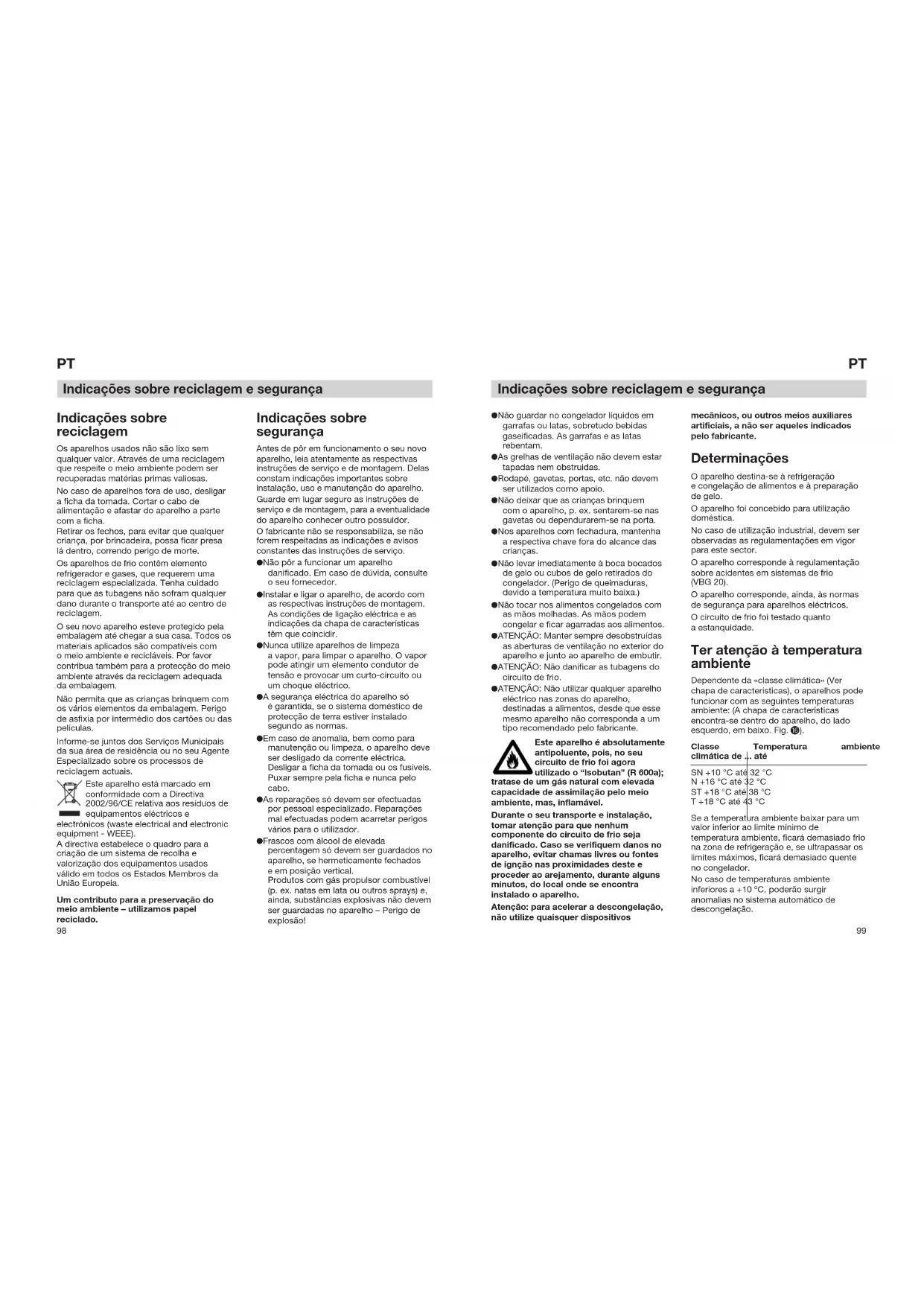 Classe Temperatura ambiente climática de ... até SN +10 °C até 32 °C N +16 °C até 32 °C ST +18 °C até 38 °C T +18 °C até 43 °C Se a temperatura ambiente baixar para um valor inferior ao limite mínimo de temperatura ambiente, ficará demasiado frio na zona de refrigeração e, se ultrapassar os limites máximos, ficará demasiado quente no congelador. No caso de temperaturas ambiente inferiores a +10 ºC, poderão surgir anomalias no sistema automático de descongelação. Indicações sobre reciclagem e segurança