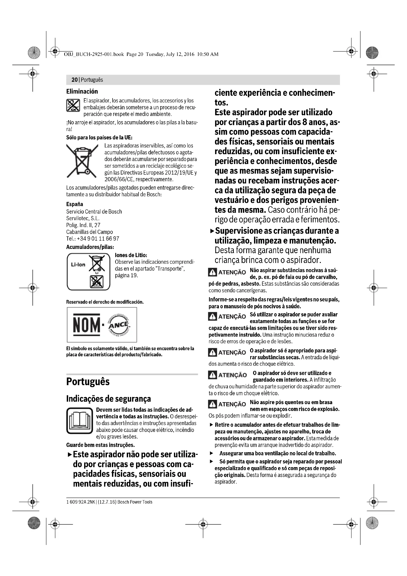 - potência limitada a temperaturas <0 °CDados técnicos averiguados com o acumulador fornecido. OBJ_BUCH-2925-001.book Page 21 Tuesday, July 12, 2016 10:50 AM22 | Português 1 609 92A 2NK | (12.7.16) Bosch Power Tools O acumulador de iões de lítio pode ser carregado a qualquer altura, sem que a sua vida útil seja reduzida. Uma interrupção do processo de carga não danifica o acumulador. O acumulador de iões de lítio está protegido por “Electronic Cell Protection (ECP)” contra descarga total. A ferramenta elétrica é desligada através de um disjuntor de proteção, logo que o acumulador estiver descarregado. A ferramenta de tra- balho não se movimenta mais. Não continue a premir o interruptor de ligar/desligar após o desligamento automático do aspirador. A bateria pode ser danificada. Observar a indicação sobre a eliminação de forma ecológica. Indicação do estado de carga do acumulador Os três LEDs verdes do indicador do nível de carga da bateria 3 indicam o nível de carga da bateria 5. O indicador do nível de carga só acende por 3 segundos após a colocação em fun- cionamento. Se depois da ligação não se acender qualquer LED, a bateria tem defeito e tem de ser substituída. Colocação/remoção da pilha (veja figuras A1 – A2) Não coloque a bateria com violência. A bateria está construída de forma a só poder ser encaixada no aspirador na posição certa. – Introduza a bateria 5 até ao limitador no compartimento da bateria 11. – Para retirar o acumulador 5 é necessário premir as teclas de destravamento 12 no acumulador e puxá-lo para fora do compartimento para o acumulador 11. Montar o bocal para juntas (veja figura B) Retire o acumulador antes de efetuar trabalhos de lim- peza ou manutenção, ajustes no aparelho, troca de acessórios ou de armazenar o aspirador. Esta medida de prevenção evita um arranque inadvertido do aspirador. O bocal para juntas 9 pode ser encaixado diretamente na câ- mara de recolha de pó 8. – Encaixe o bocal para juntas 9 com a marca indicada na fi- gura virada para baixo no orifício de aspiração 10 na câma- ra de recolha de pó 8. Funcionamento Retire o acumulador antes de efetuar trabalhos de lim- peza ou manutenção, ajustes no aparelho, troca de acessórios ou de armazenar o aspirador. Esta medida de prevenção evita um arranque inadvertido do aspirador. Colocação em funcionamento Antes de aspirar, certifique-se de que a unidade de fil- tragem está bem montada. Utilize apenas filtros não danificados (sem fissuras, sem furos etc.). Substitua imediatamente um filtro da- nificado. Ligar e desligar Para poupar energia só deverá ligar o aspirador quando ele for utilizado. –Para ligar o aspirador, prima a tecla de ligar-desligar 2. –Para desligar o aspirador, prima novamente a tecla de li- gar-desligar 2. Manutenção e serviço Manutenção e limpeza Retire o acumulador antes de efetuar trabalhos de lim- peza ou manutenção, ajustes no aparelho, troca de acessórios ou de armazenar o aspirador. Esta medida de prevenção evita um arranque inadvertido do aspirador. Manter o aspirador e as aberturas de ventilação sem- pre limpas, para trabalhar bem e de forma segura. – De tempos a tempos, limpe a carcaça do aspirador com um pano húmido. – Limpe os contactos de carga sujos com um pano seco. Limpar a câmara de recolha de pó (veja figuras C1–C3) Limpe a câmara de recolha de pó 8 após cada utilização, para atingir a capacidade ideal do aspirador. – Mantenha o aspirador ligeiramente inclinado para baixo, para que ao abrir o aspirador o pó não consiga cair da câ- mara de recolha de pó. – Prima a tecla de destravamento 1 e retire a câmara de re- colha de pó 8 da carcaça do motor 7. – Utilizando o entalhe 13 na carcaça do motor 7, retire a uni- dade de filtragem 15 na vedação do filtro 14 da carcaça do motor. – Agite a câmara de recolha de pó 8 sobre um caixote de lixo apropriado. – Se necessário, limpe a câmara de recolha de pó com um pano húmido. Se necessário, limpe a unidade de filtragem (ver “Limpar a unidade de filtragem”, página 22). – Volte a inserir a unidade de filtragem 15 com a vedação do filtro 14 na carcaça do motor 7. Em seguida, prenda a câmara de recolha de pó em baixo na carcaça do motor e pressione-a ligeiramente até engatar de forma audível. Limpar a unidade de filtragem (veja figura D) A unidade de filtragem 15 não pode ser limpa com líquidos. – Mantenha o aspirador ligeiramente inclinado para baixo, para que ao abrir o aspirador o pó não consiga cair da câ- mara de recolha de pó. – Prima a tecla de destravamento 1 e retire a câmara de re- colha de pó 8 da carcaça do motor 7. – Utilizando o entalhe 13 na carcaça do motor 7, retire a uni- dade de filtragem 15 na vedação do filtro 14 da carcaça do motor. – Escove as lamelas do filtro com pregas com uma vassoura macia. – A montagem é feita pela ordem inversa. LED Capacidade Luz permanente 3 x verde ≥ 2/3 Luz permanente 2 x verde ≥ 1/3 Luz permanente 1 x verde <1/3 Luz intermitente 1 x verde Reserva OBJ_BUCH-2925-001.book Page 22 Tuesday, July 12, 2016 10:50 AMItaliano | 23 Bosch Power Tools 1 609 92A 2NK | (12.7.16) Avarias Se a potência de aspiração for insuficiente deverá controlar: – A câmara de recolha de pó 8 está cheia? ▷ Ver “Limpar a câmara de recolha de pó”, página 22. – O filtro de pregas está obstruído por pó? ▷ Ver “Limpar a unidade de filtragem”, página 22. – A capacidade da bateria está muito fraca? ▷ Ver “Carregar o acumulador”, página 21. O esvaziamento regular da câmara de recolha de pó 8 e a lim- peza da unidade de filtragem 15 assegura um poder de aspi- ração ideal. Se em seguida a potência de aspiração não for alcançada, o aspirador deverá ser levado ao serviço pós-venda. Serviço pós-venda e consultoria de aplicação O serviço pós-venda responde às suas perguntas a respe