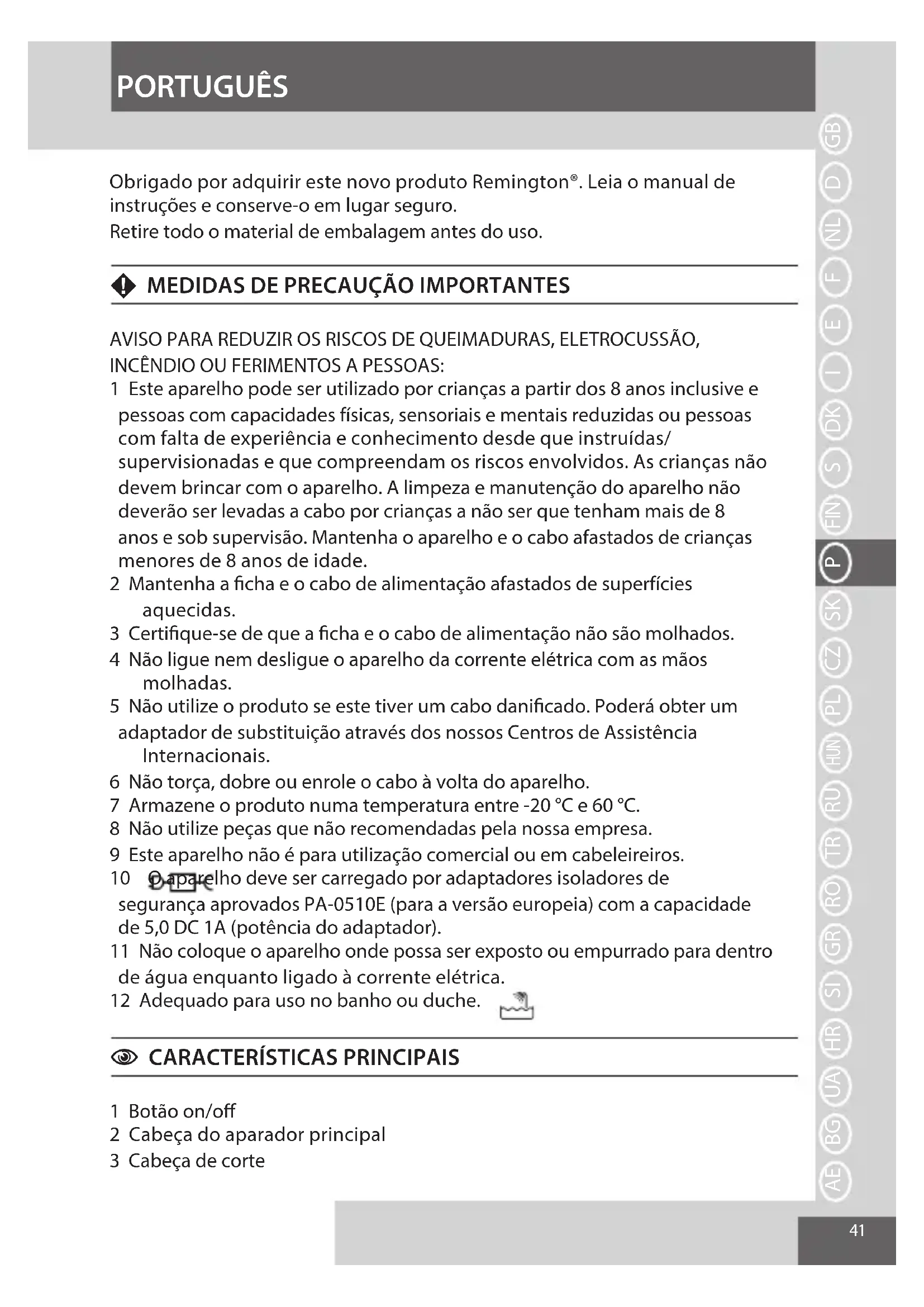AVISO PARA REDUZIR OS RISCOS DE QUEIMADURAS, ELETROCUSSÃO, INCÊNDIO OU FERIMENTOS A PESSOAS: 1 Este aparelho pode ser utilizado por crianças a partir dos 8 anos inclusive e pessoas com capacidades físicas, sensoriais e mentais reduzidas ou pessoas com falta de experiência e conhecimento desde que instruídas/ supervisionadas e que compreendam os riscos envolvidos. As crianças não devem brincar com o aparelho. A limpeza e manutenção do aparelho não deverão ser levadas a cabo por crianças a não ser que tenham mais de 8 anos e sob supervisão. Mantenha o aparelho e o cabo afastados de crianças menores de 8 anos de idade. 2 Mantenha a cha e o cabo de alimentação afastados de superfícies aquecidas. 3 Certique-se de que a cha e o cabo de alimentação não são molhados. 4 Não ligue nem desligue o aparelho da corrente elétrica com as mãos molhadas. 5 Não utilize o produto se este tiver um cabo danicado. Poderá obter um adaptador de substituição através dos nossos Centros de Assistência Internacionais. 6 Não torça, dobre ou enrole o cabo à volta do aparelho. 7 Armazene o produto numa temperatura entre -20 °C e 60 °C. 8 Não utilize peças que não recomendadas pela nossa empresa. 9 Este aparelho não é para utilização comercial ou em cabeleireiros. 10 O aparelho deve ser carregado por adaptadores isoladores de segurança aprovados PA-0510E (para a versão europeia) com a capacidade de 5,0 DC 1A (potência do adaptador). 11 Não coloque o aparelho onde possa ser exposto ou empurrado para dentro de água enquanto ligado à corrente elétrica. 12 Adequado para uso no banho ou duche.