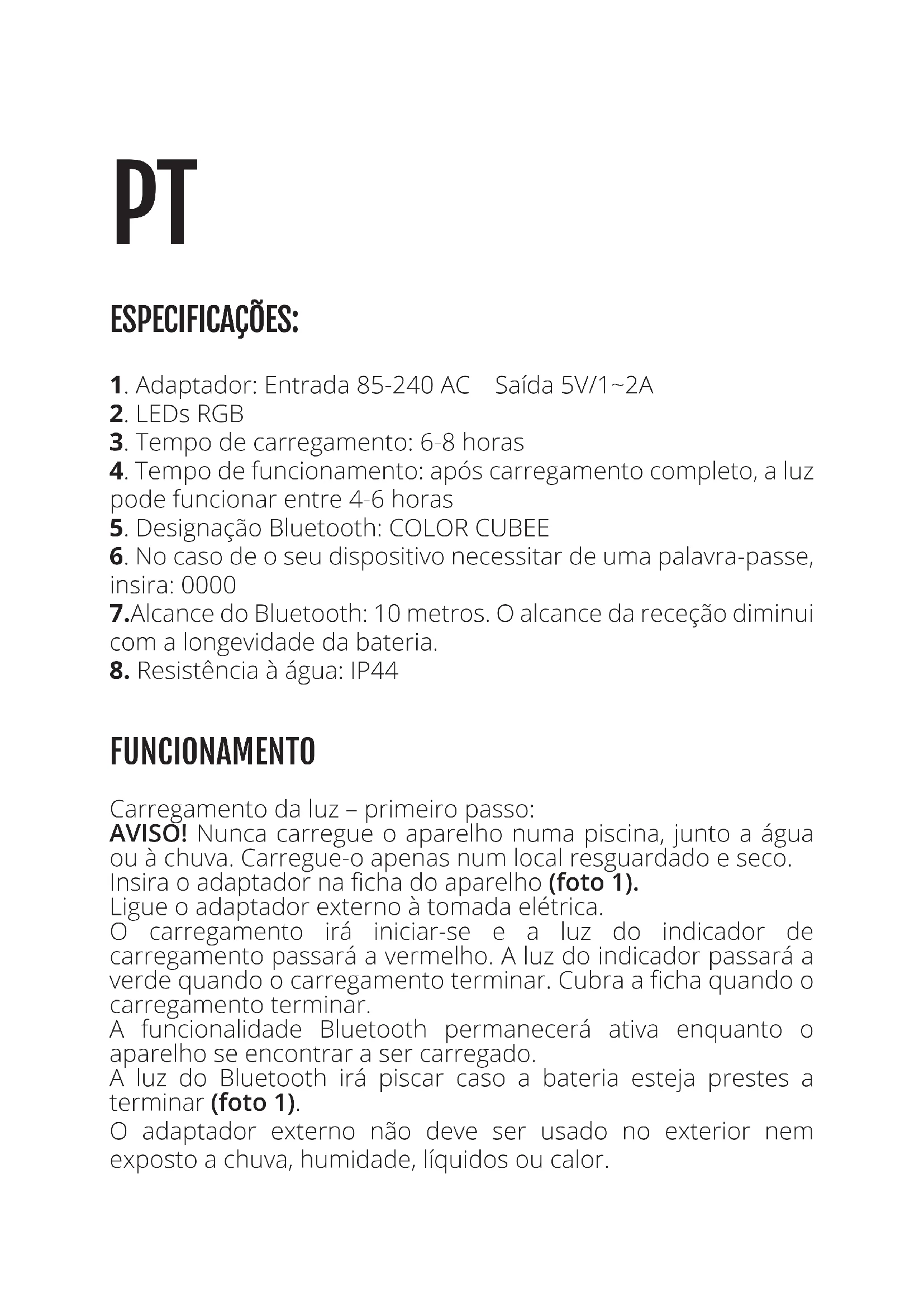 - Tempo de funcionamento: após carregamento completo, a luz pode funcionar entre 4-6 horas