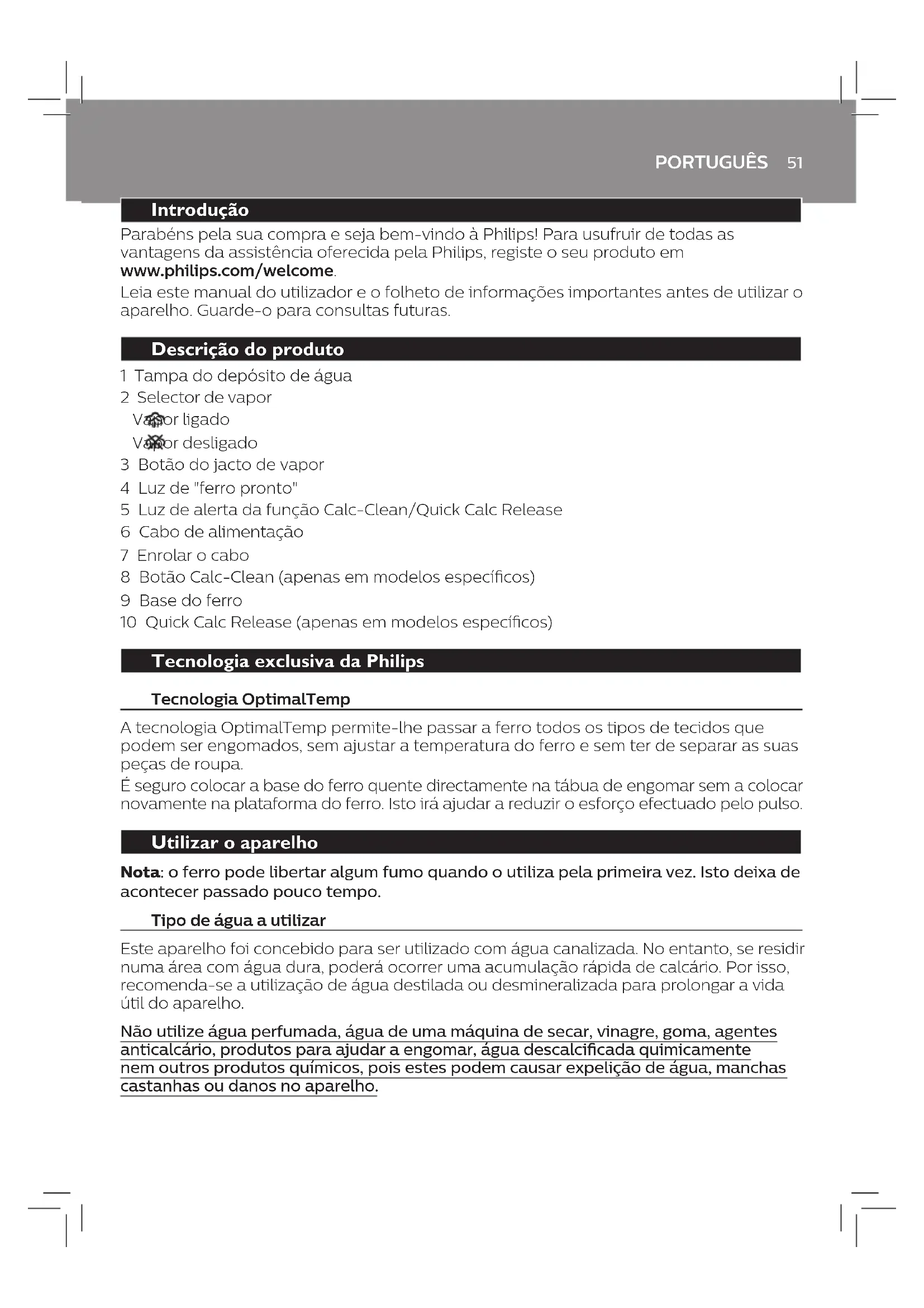 3 Abra o manípulo do colector do Quick Calc Release (Fig.2-4) e retire o colector (Fig.2-5). 4 Limpe o colector do Quick Calc Release (Fig. 2-6, Fig. 2-7). 5 Agite suavemente o aparelho para permitir que as partículas de calcário caiam (Fig. 2-8). 6 Insira o colector Quick Calc Release de volta no aparelho (Fig. 2-10). 7 Pressione o manípulo (até ouvir um "clique") para bloquear o colector (Fig. 2-11). Calc-Clean (apenas em modelos especícos) IMPORTANTE: depois de 1 a 3 meses de utilização, a luz de alerta Calc-Clean ca intermitente para lhe relembrar de que deve utilizar a função Calc-Clean (Fig. 3-1). Esta função serve para remover partículas de calcário presentes no seu ferro de engomar para prolongar a vida útil do mesmo. Sugestão: a função Calc-Clean pode ser utilizada a qualquer momento, mesmo quando a luz de alerta ainda não foi activada. Caso viva numa zona de água dura, utilize a função com mais regularidade. 1 Certique-se de que o selector de vapor está denido para a posição "Vapor desligado" (Fig. 3-2). 2 certique-se de que há água suciente (mais de 3/4) no depósito de água. Se não tiver água suciente, desligue o ferro da tomada, encha o depósito com água até ao indicador MAX (Fig.3-3) e ligue o ferro novamente (Fig.3-4). Não deite vinagre nem outros produtos descalcicantes no depósito de água. 3 Espere que o ferro aqueça. Isto demora cerca de 2 minutos (Fig.3-5). Nota: a luz de alerta Calc-Clean desliga-se durante o aquecimento. 4 Desligue a cha do ferro quando a luz de "ferro pronto" pára a respiração (Fig. 3-7). 5 Segure o ferro sobre o lava-loiça. Mantenha o botão Calc-Clean premido e agite suavemente o ferro de um lado para o outro até gastar a água no depósito de água (Fig. 3-8). O calcário é expelido. Também saem vapor e água a ferver pela base. Nota: repita os passos 2 a 5, se a água que sai do aparelho continuar a conter partículas de calcário. 6 Ligue o aparelho à tomada e deixe-o aquecer para secar a base. Isto demora cerca de 2 minutos (Fig. 3-9). 7 Desligue o aparelho da tomada (Fig. 3-10). Mova o ferro suavemente sobre um pano para retirar quaisquer manchas de água da base (Fig. 3-11). Resolução de problemas Este capítulo resume os problemas mais comuns que podem surgir no aparelho. Se não conseguir resolver o problema com as informações fornecidas a seguir, visite www.philips.com/support para consultar uma lista de perguntas mais frequentes ou contacte o centro de assistência ao cliente no seu país.PORTUGUÊS