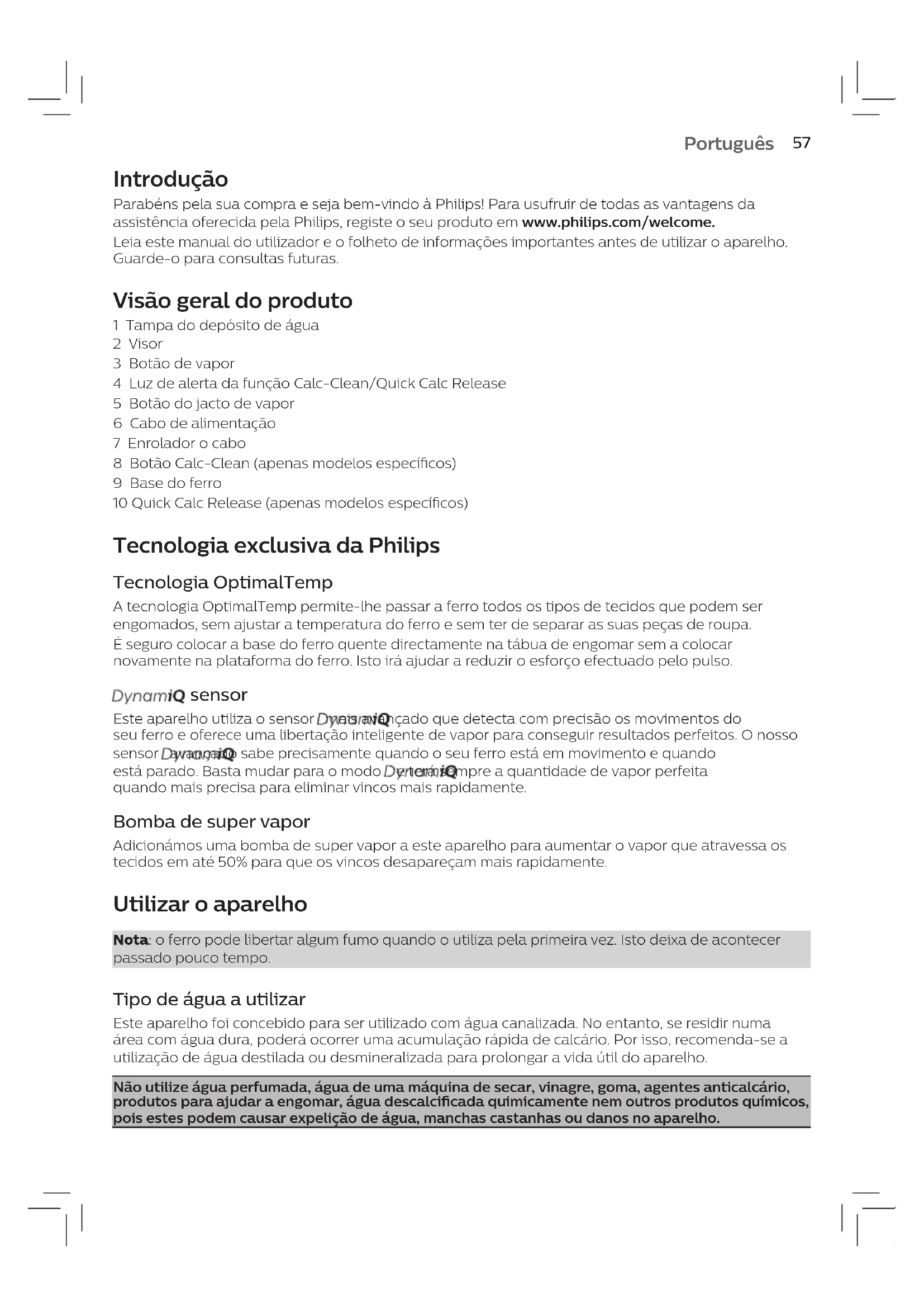EspañolIntrodução Parabéns pela sua compra e seja bem-vindo à Philips! Para usufruir de todas as vantagens da assistência oferecida pela Philips, registe o seu produto em www.philips.com/welcome. Leia este manual do utilizador e o folheto de informações importantes antes de utilizar o aparelho. Guarde-o para consultas futuras. Visão geral do produto 1 Tampa do depósito de água 2 Visor 3 Botão de vapor 4 Luz de alerta da função Calc-Clean/Quick Calc Release 5 Botão do jacto de vapor 6 Cabo de alimentação 7 Enrolador o cabo 8 Botão Calc-Clean (apenas modelos especícos) 9 Base do ferro 10 Quick Calc Release (apenas modelos especícos) Tecnologia exclusiva da Philips Tecnologia OptimalTemp A tecnologia OptimalTemp permite-lhe passar a ferro todos os tipos de tecidos que podem ser engomados, sem ajustar a temperatura do ferro e sem ter de separar as suas peças de roupa. É seguro colocar a base do ferro quente directamente na tábua de engomar sem a colocar novamente na plataforma do ferro. Isto irá ajudar a reduzir o esforço efectuado pelo pulso. sensor Este aparelho utiliza o sensor mais avançado que detecta com precisão os movimentos do seu ferro e oferece uma libertação inteligente de vapor para conseguir resultados perfeitos. O nosso sensor avançado sabe precisamente quando o seu ferro está em movimento e quando está parado. Basta mudar para o modo e terá sempre a quantidade de vapor perfeita quando mais precisa para eliminar vincos mais rapidamente. Bomba de super vapor Adicionámos uma bomba de super vapor a este aparelho para aumentar o vapor que atravessa os tecidos em até 50% para que os vincos desapareçam mais rapidamente. Utilizar o aparelho Nota: o ferro pode libertar algum fumo quando o utiliza pela primeira vez. Isto deixa de acontecer passado pouco tempo. Tipo de água a utilizar Este aparelho foi concebido para ser utilizado com água canalizada. No entanto, se residir numa área com água dura, poderá ocorrer uma acumulação rápida de calcário. Por isso, recomenda-se a utilização de água destilada ou desmineralizada para prolongar a vida útil do aparelho. Não utilize água perfumada, água de uma máquina de secar, vinagre, goma, agentes anticalcário, produtos para ajudar a engomar, água descalcicada quimicamente nem outros produtos químicos, pois estes podem causar expelição de água, manchas castanhas ou danos no aparelho.