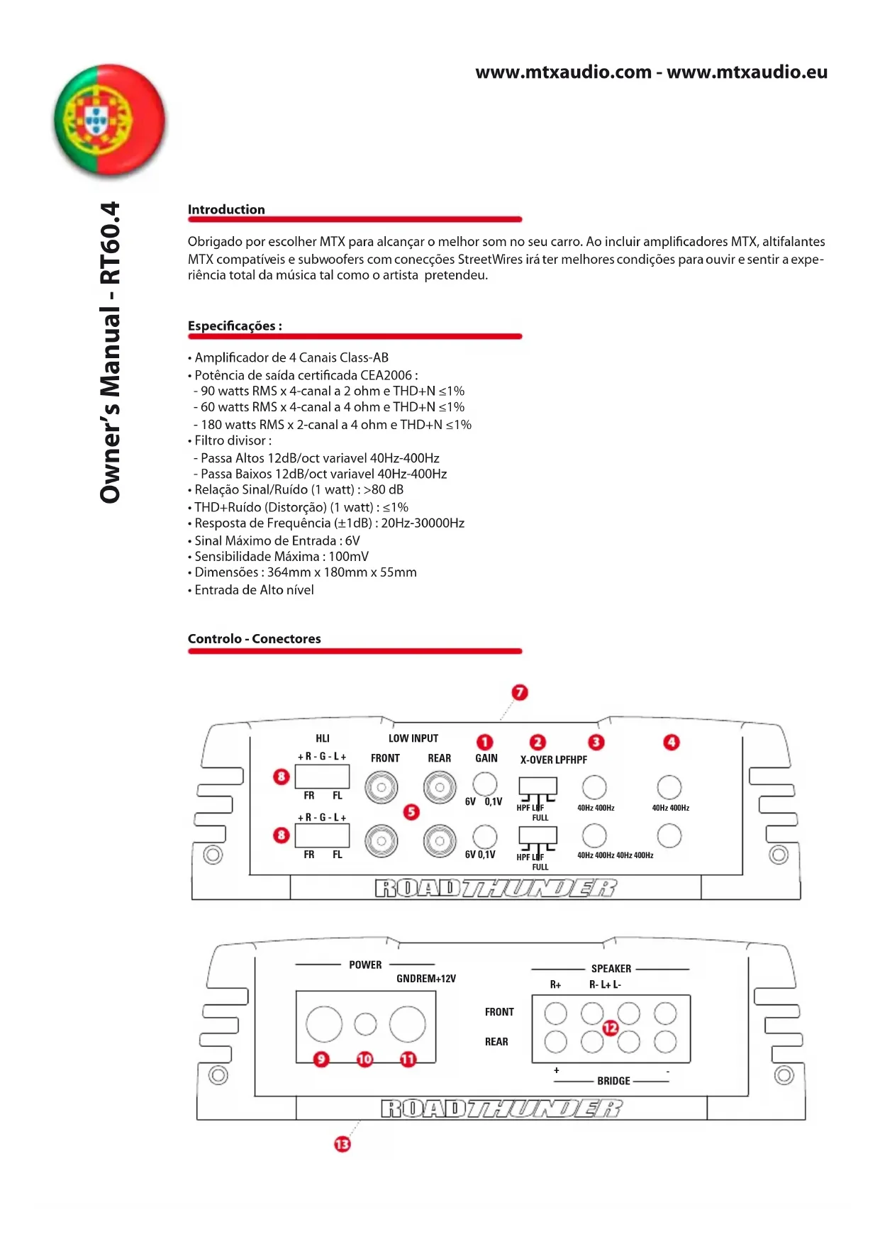 Comutador de X-Over, Passa baixos, Passa altos (X-OVER) : Na posição “LPF”, o divisor activo passa baixos (LP) está ligado. Na posição “HPF”, o divisor activo passa altos (HP) está ligado. Na posição“FULL” , o divisor activo (x-over) está desligado. Controlo de frequência do divisor passa altos (HPF) : Use para seleccionar a frequência desejada de corte do ltro passa altos. A frequência é ajustável entre 40Hz e 400Hz. Controlo de frequência do divisor passa baixos (LPF) : Use para seleccionar a frequência desejada de corte do ltro passa baixos. A frequência é ajustável entre 40Hz e 400Hz. Entradas RCA (LOW INPUT) : Estas entradas RCA são usadas com fontes que têm saídas de linha (RCA). O nível minimo de sinal é de 100mV. MTX recomenda o uso de cabos de sinal de alta qualidade de par entrançado (tal como StreetWires) para reduzir a possibilidade de ruído radiado entrar no sistema. LED Power On/Protecção : O LED acende encarnado quando o amplicador está ligado. Se o amp estiver em curto circuito ou em protecção térmica, o LED cará a piscar. Entradas de nível de altifalante - alto nível (HLI) : Esta entrada permitirá que o amplicador opere com as saídas de altifalante de unidades fonte. Os os de altifalante da unidade fonte devem ser conectados à cablagem for- necida com o amplicador. Nota : Quando as entradas de alto nível(altifalante) forem usadas, um o de remote deve ser usado para ligar/desliagr o amplicador. (+12V) Terminal de Alimentação : Esta é a entrada de potência no amplicador e deve se ligada directamente ao terminal positivo da bateria do carro para que o amp opere devidamente. Use de cuidado quando passar este cabo ao longo do veículo. Evite que este cabo passe ao lado de cabos RCA, de antena, ou outro equipamento sensível já que a elevada currente uindo por este cabo pode induzir ruído para dentro do seu sistema. É tam- bém muito importante ter uma conecção de qualidade para a máxima performance. Recomendamos o uso de cabo de 10mm2 como MTX RT60.4. Terminal remoto (REM) : O amplicador pode ser ligado ao aplicar 12 volts neste terminal. Tipicamente, esta voltagem é fornecida por um o da unidade fonte marcado “remote” ou “electric antenna”. Terminal de massa (GND) : Uma boa ligação de massa é precisa para a boa operação do seu amplicador. Um cabo curto do mesmo calibre do cabo de alimentaçãodeve ser usado para conectar o terminal de massa direc- tamente ao chassis do veículo. Deve remover a tinta da superfície, expondo o metal limpo onde zer a ligação de massa. Terminais de altifalante (SPEAKER) : Conecte os altifalantes a estes terminais. Observe a polaridade dos altiu- falantes atavés do sistema. Fase errada pode resultar em perda da resposta de graves e/ou pobre qualidade de som em geral. Modo em ponte : quando pontear o a*, use o terminal positivo direito e o terminal negativo esquerdo sòmente. Aviso : não coloque em modo ponte com impedância inferior a 4 ohm. Fusível (FUSE) : Se um fusível queimar, substitua com um do mesmo valor. Nunca use um valor maior ! Cuidado : fusíveis localizados debaixo do amplicadorwww.mtxaudio.com - www.mtxaudio.eu Owner’s Manual - RT60.4 Instalação & Montagem A MTX recomenda que proceda à instalação do seu novo amplicador RoadTHUNDER através de um agente autorizado MTX. Qualquer desvio das especicações de instalação recomendadas pode causar prejuízo grave ao amplicador, altifalantes e/ou sistema eléctrico do veículo. Por favor verique muito bem as conecções antes de ligar o sistema.
