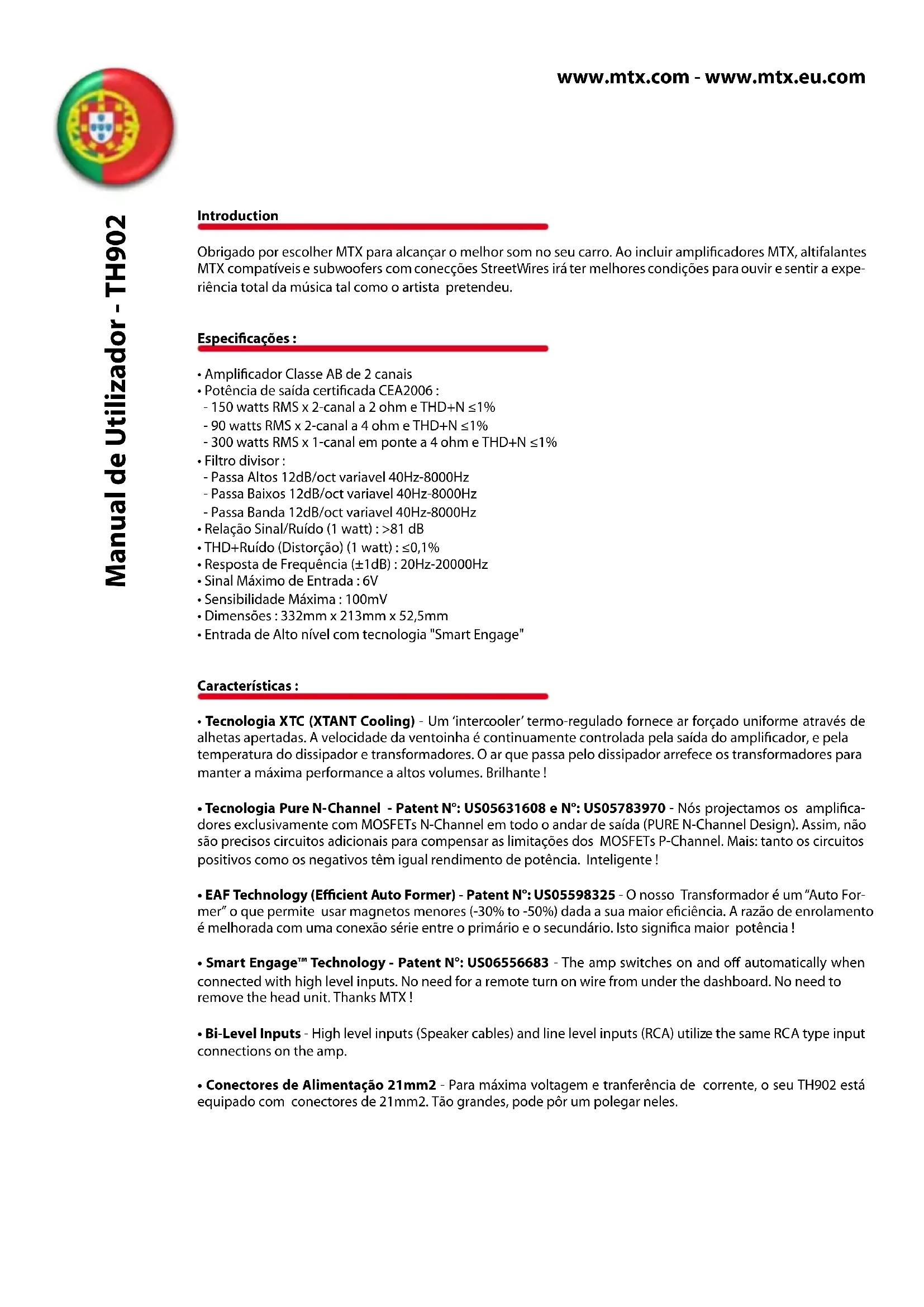Obrigado por escolher MTX para alcancar o melhor som no seu carro. Ao inclui amplificadores MTX, altifalantes MTX compatíveis e subwoofer com conecções StreetWires irá ter melhores condições para ouvir e encontrar a experiencia total da música tal como o artista pretendeu.