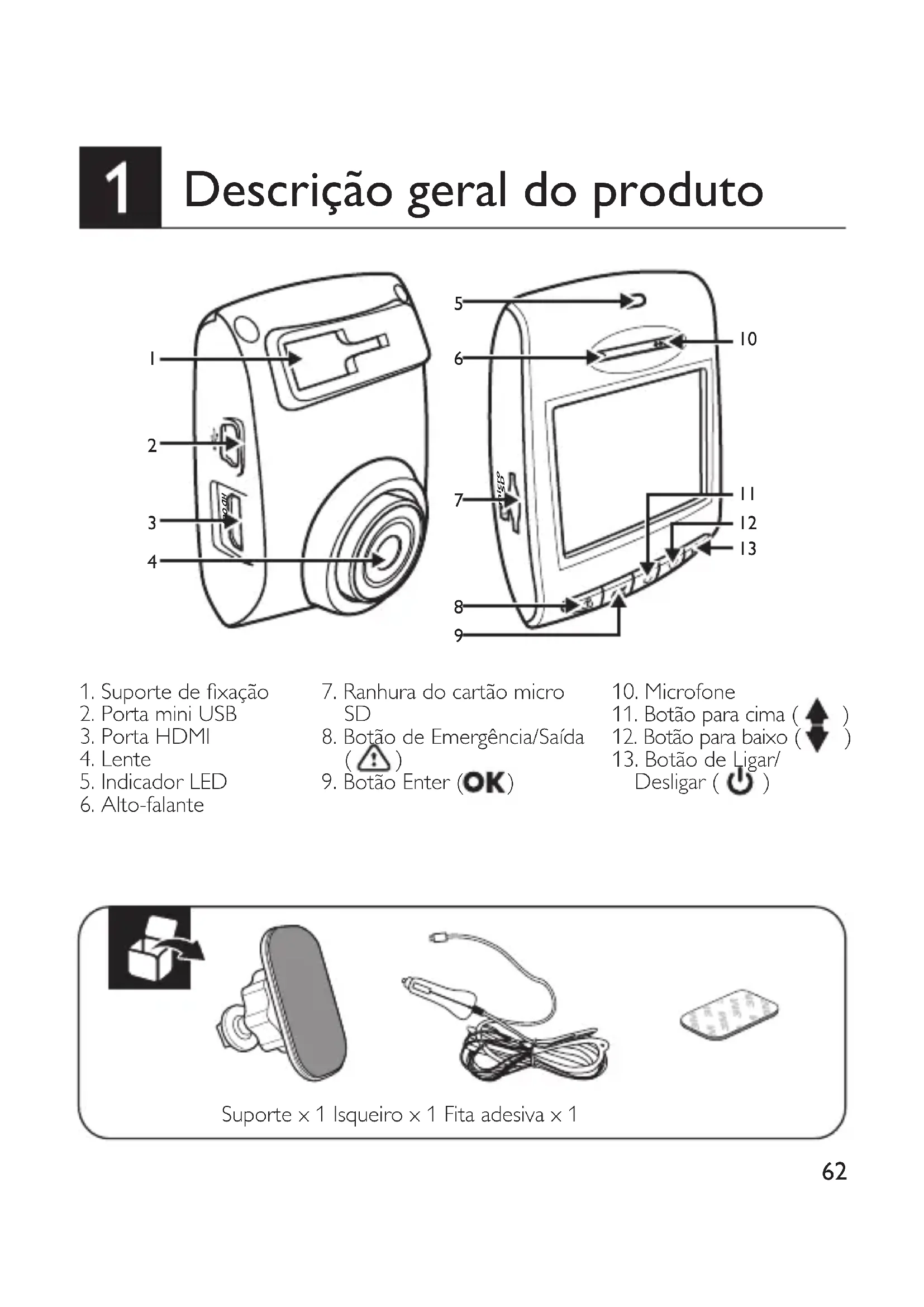 Especicaçõestécnicas Funções automáticas Gravação automática Detecção de Colisão e proteção de cheiros de emergência Gravação integral contínua Exposição automática Equilíbrio do branco automático Carimbo de data/hora LCD Auto Off Alarme de Fadiga Sensor de Imagem CMOS 3.1 Megapíxeis Resolução de vídeo Full HD (1920 x 1080 p) a 30 fps Ecrã LCD 2” 480*234 pontos Ângulo de Abertura F/#2.0 Lente Fixa Lente grande angular, FOV 100 (Diagonal), vidro de 5 camadas Formato do Ficheiro .MOV Compressão de áudio AVC/Compressão de vídeo H.264 RAM 64 M x 16 bit (1 Gbits) DDR2 SDRAM Memória Interna Flash SPI 64 Mb Suporte de dados de gravação Cartão micro SD (classe 6 ou superior, até 32 GB) Relógio de Tempo Real Período de Retenção Pelo menos 5 dias Tempo de Gravação 200 min com 16 GB para full HD 280 min com 16 GB para HD Premium Temperatura de Funcionamento 0℃ ~ 65℃ Temperatura de Armazenamento -20℃ ~ 70℃ Acessórios Carregador mini USB para automóvel, Suporte de montagem, Fita adesiva Interface Mini USB 2.0, Mini HDMI, ranhura Micro SD, Microfone, Alto-falante Idiomas Inglês, Francês, Alemão, Italiano, Espanhol, Português, polonês e russo Potência Adaptador para o automóvel de 12-24 V Unidade principal: 5 V/1 A Dimensões (C x L x A) 72,8 x 53,3 x 31,34 mmmicro