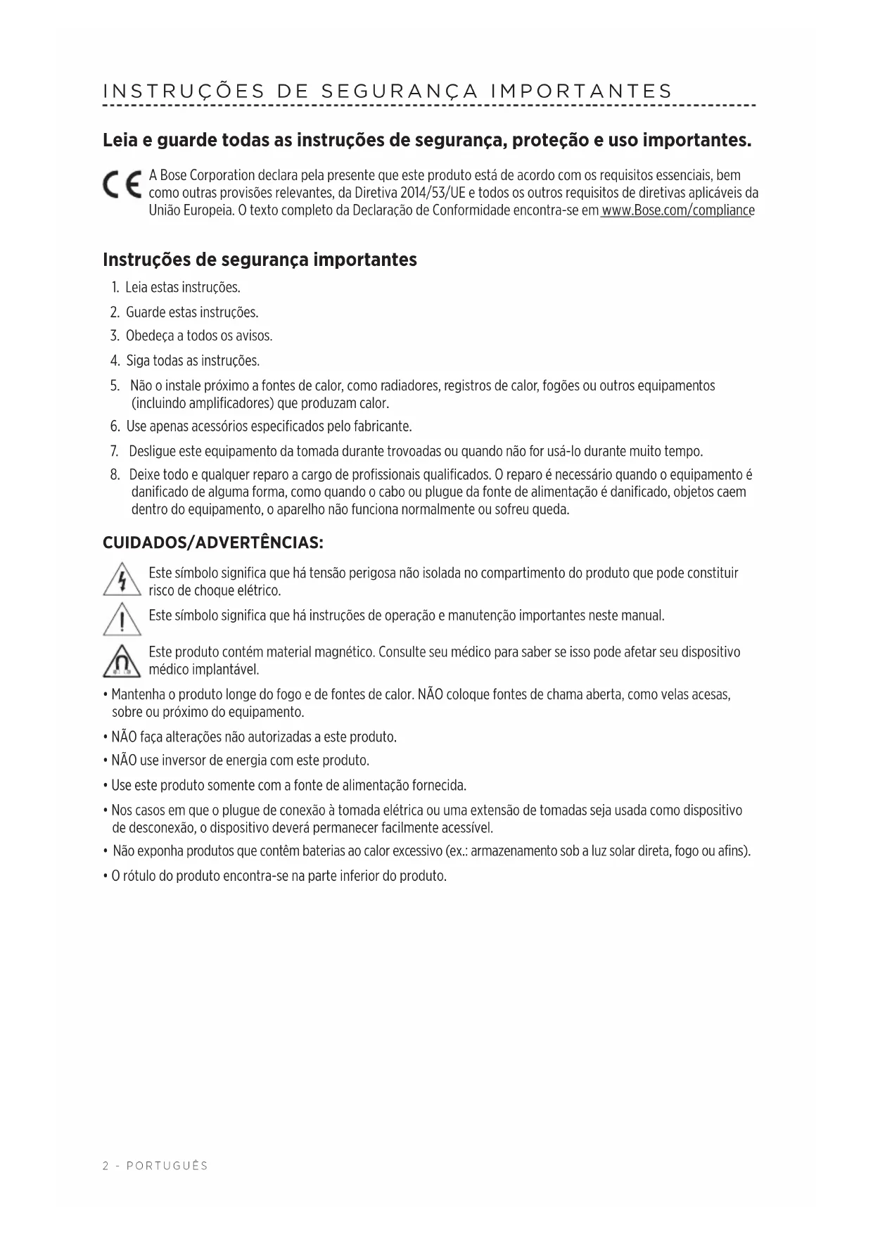 Leia e guarde todas as instruções de segurança, proteção e uso importantes. A Bose Corporation declara pela presente que este produto está de acordo com os requisitos essenciais, bem como outras provisões relevantes, da Diretiva 2014/53/UE e todos os outros requisitos de diretivas aplicáveis da União Europeia. O texto completo da Declaração de Conformidade encontra-se em www.Bose.com/compliance Instruções de segurança importantes