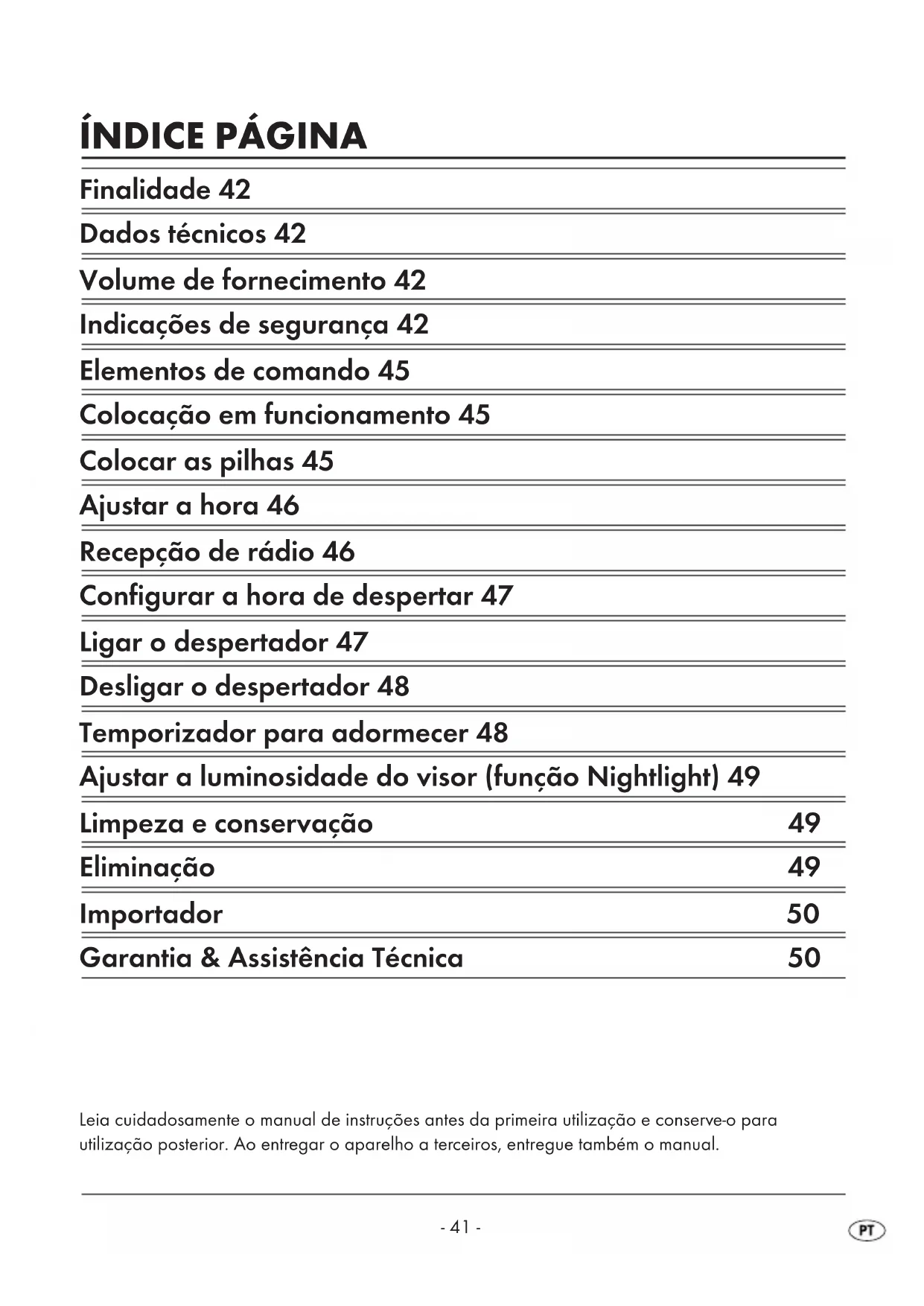 kompernass.com IB_KH2236-39_NL_LB1 12.10.2007 18:01 Uhr Seite 40ÍNDICE PÁGINA Finalidade 42 Dados técnicos 42 Volume de fornecimento 42 Indicações de segurança 42 Elementos de comando 45 Colocação em funcionamento 45 Colocar as pilhas 45 Ajustar a hora 46 Recepção de rádio 46 Configurar a hora de despertar 47 Ligar o despertador 47 Desligar o despertador 48 Temporizador para adormecer 48 Ajustar a luminosidade do visor (função Nightlight) 49 Limpeza e conservação 49 Eliminação 49 Importador 50 Garantia & Assistência Técnica 50 Leia cuidadosamente o manual de instruções antes da primeira utilização e conserve-o para utilização posterior. Ao entregar o aparelho a terceiros, entregue também o manual.