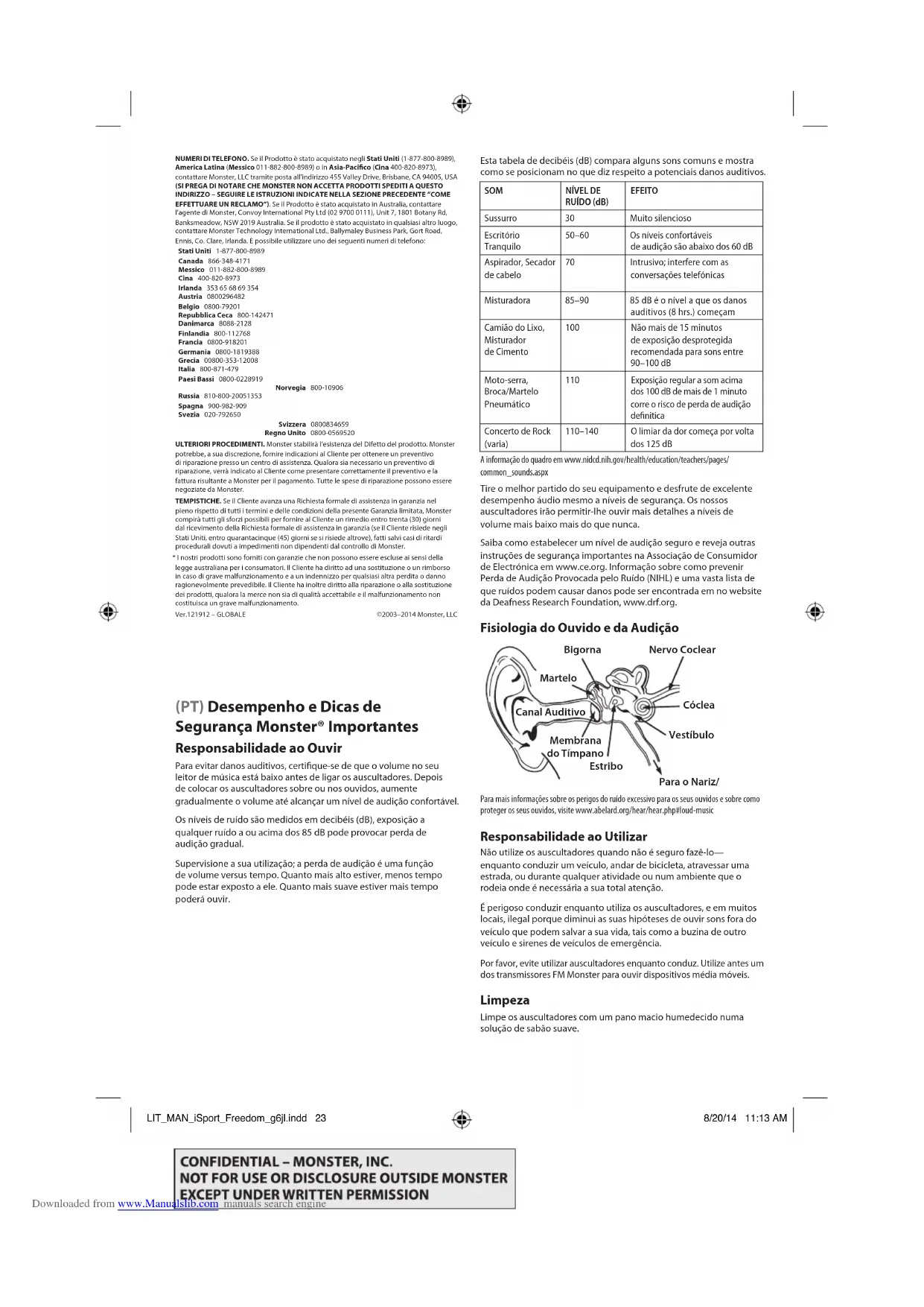 A Monster, LLC, 7251 West Lake Mead Blvd., Las Vegas, NV 89128, USA, [NOTE QUE A MONSTER NÃO ACEITA PRODUTOS ENVIADOS PARA ESTA MORADA – SIGA AS INSTRUÇÕES ABAIXO, NA SECÇÃO “COMO EFETUAR UMA RECLAMAÇÃO”] (415) 840-2000 (“Monster”) oferece-lhe esta Garantia Limitada. A lei estatutária e comum poderá oferece-lhe direitos ou soluções adicionais, que não serão afetados por esta Garantia Limitada.DEFINIÇÕES“Utilização adequada” signica a utilização pessoal do produto (i) para ns privados (em oposição a ns comerciais), (ii) de acordo com a lei, códigos ou regulamentos vigentes (incluindo sem limitação códigos de construção e/ou elétricos), (iii) em conformidade com as recomendações e/ou instruções do fabricante e/ou instruções em materiais que acompanham o Produto e, (iv) se aplicável, com a correta ligação à massa.“Representante autorizado” signica qualquer distribuidor, revendedor ou retalhista que (i) tenha sido devidamente autorizado para a venda do produto ao abrigo das leis da jurisdição em que comprou o Produto, (ii) tenha efetuado a compra do Produto diretamente à Monster ou a terceiros com uma relação contratual com a Monster e de acordo com os termos e condições autorizados de tal acordo e (iii) que tenha vendido o Produto novo e na sua embalagem original.“Reclamação formal ao abrigo da garantia” signica uma reclamação efetuada de acordo com a secção “Reclamações formais ao abrigo da garantia” aqui incluída.“Produto” signica um Produto (i) que se encontre na seguinte Tabela de especicações, (ii) que tenha sido comprado a um Representante autorizado novo e na sua embalagem original e (iii) cujo número de série, se existir, não tenha sido removido, alterado ou violado.“Defeito do Produto” ou “Produto defeituoso” implica uma inadequação do Produto existente à data de receção do Produto de um Representante autorizado e que provoque a falha do Produto face ao desempenho descrito na documentação que acompanha o Produto da Monster, a menos que tal falha tenha sido provocada total ou parcialmente por (a) qualquer utilização diferente da Utilização adequada, (b) transporte, negligência, utilização indevida ou abuso por qualquer utilização que não os funcionários da Monster; (c) alteração, violação ou modicação do Produto por qualquer pessoa que não os funcionários da Monster; (d) acidente (para além de qualquer avaria que se possa qualicar como Defeito do Produto); (e) manutenção ou serviço do Produto por pessoas alheias à Monster; (f) exposição do Produto ao calor, exposição à luz direta, sol, substâncias líquidas, areia ou outras substâncias contaminantes; ou (g) atos alheios ao controlo da Monster, incluindo sem limitação atos de Deus, incêndios, tempestades, sismos ou inundações.“Período da garantia” signica o período durante o qual a Monster deve receber a sua Reclamação formal ao abrigo da garantia. Os diferentes Períodos da garantia relacionados com Defeitos do Produto são denidos na seguinte Tabela de especicações. O Período da garantia tem início na data de compra ou receção (o que ocorrer mais tarde) do Produto de um Representante autorizado tal como evidenciado na fatura, recibo de venda ou talão do Representante autorizado. Se não tiver um comprovativo escrito ou recibo da data de compra, o Período da garantia começa três (3) meses após a data em que o Produto saiu das instalações da Monster ou das suas fábricas, tal como evidenciado pelos registos da Monster. O Período da garantia termina após o período de tempo denido na Tabela de especicações ter chegado ao m ou após transferência da propriedade do Produto, o que ocorrer primeiro. Deve ainda contactar a Monster e obter um Número de Autorização de Devolução (descrito em “Como efetuar uma reclamação formal”) num prazo de dois (2) meses após descobrir um Defeito do produto (ou, conforme aplicável, se tal Defeito do Produto for óbvio).“Você” signica a primeira pessoal individual que comprou o Produto na sua embalagem original a um Representante autorizado. Esta Garantia limitada não se aplica a pessoas ou entidades que tenham comprado o Produto (i) na sua forma usada ou não embalada, (ii) para revenda, cedência ou outra utilização comercial ou (iii) a alguém que não se qualique como o Representante autorizado.ÂMBITO DESTA GARANTIA LIMITADAPRODUTOS. Se um Produto continha um Defeito do produto no momento da compra a um Representante autorizado e a Monster receber uma Reclamação formal ao abrigo da garantia (i) num prazo de dois (2) meses depois de descobrir tal Defeito do produto (ou conforme aplicável, se tal Defeito do produto for óbvio) e (ii) antes do m do Período da garantia para Defeitos do produto aplicável ao Produto defeituoso, a Monster facultará LIT_MAN_iSport_Freedom_g6jl.indd 25 8/20/14 11:13 AM Downloaded from www.Manualslib.com manuals search engineuma das seguintes soluções: a Monster procederá (1) à reparação ou, ao exclusivo critério da Monster; à substituição do Produto defeituoso ou (2) ao reembolso do preço pago à Monster ou ao Representante autorizado pelo Produto defeituoso se a reparação ou a substituição não forem comercialmente viáveis ou atempadas. NOTA: NA EXTENSÃO MÁXIMA PERMITIDA PELA LEI VIGENTE, A MONSTER NÃO ASSUME QUALQUER RESPONSABILIDADE POR QUAISQUER DANOS ACIDENTAIS, CONSEQUENCIAIS OU INDIRETOS AO ABRIGO DESTA GARANTIA LIMITADA.DISPOSIÇÕES GERAISESCOLHA DO FORO/JURISDIÇÃO. Esta Garantia limitada e quaisquer disputas resultantes ou ligadas a esta Garantia limitada (“Disputas”) deverá ser regida pelas leis da jurisdição em que comprou o Produto. OUTROS DIREITOS. ESTA GARANTIA LIMITADA CONFERE-LHE DIREITOS LEGAIS ESPECIAIS E PODERÁ USUFRUIR DE OUTROS DIREITOS, QUE VARIAM DE JURISDIÇÃO PARA JURISDIÇÃO, E QUE NÃO SERÃO AFETADOS POR ESTA GARANTIA LIMITADA.* E