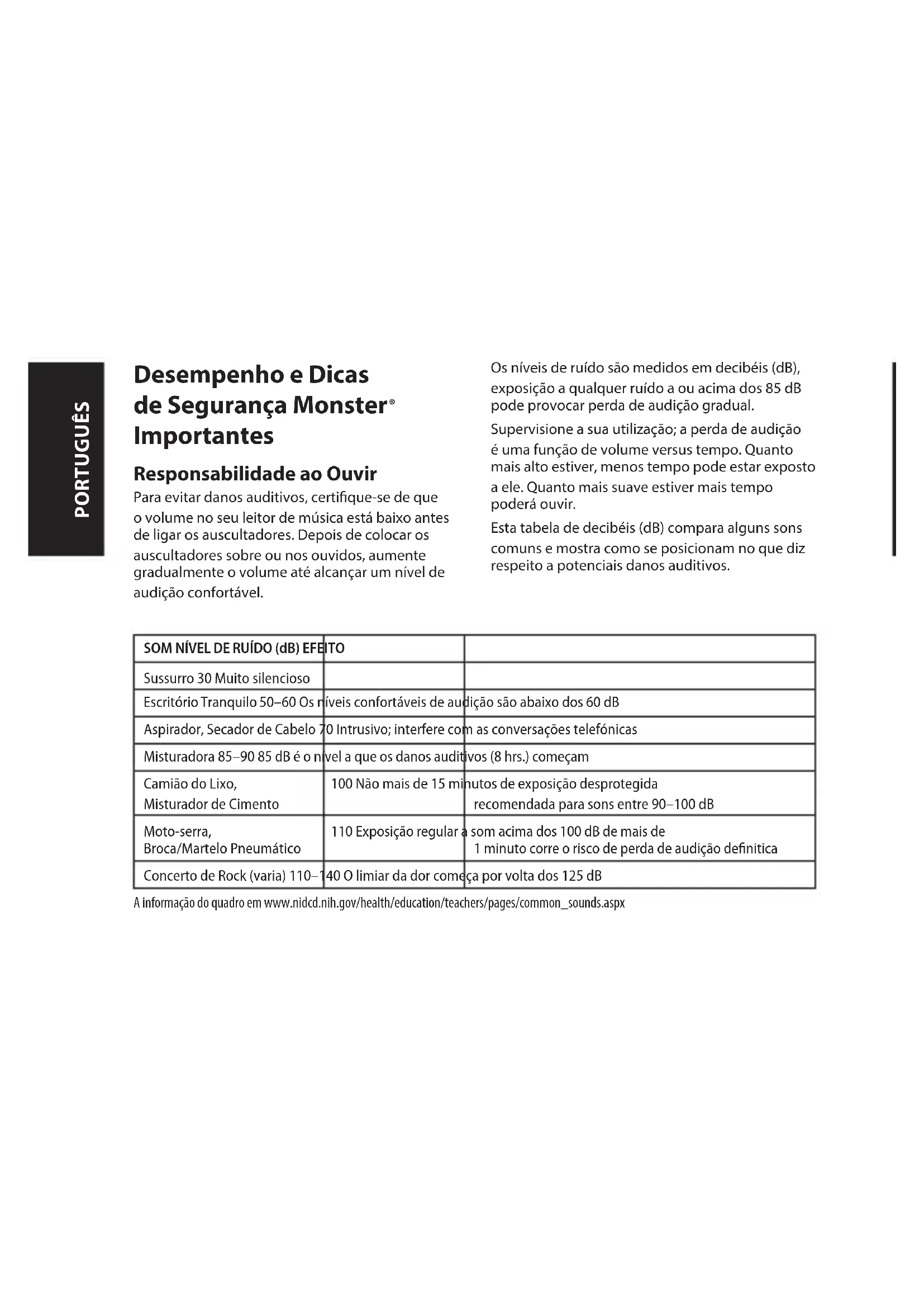 Importantes Responsabilidade ao Ouvir Para evitar danos auditivos, certique-se de que o volume no seu leitor de música está baixo antes de ligar os auscultadores. Depois de colocar os auscultadores sobre ou nos ouvidos, aumente gradualmente o volume até alcançar um nível de audição confortável. Os níveis de ruído são medidos em decibéis (dB), exposição a qualquer ruído a ou acima dos 85 dB pode provocar perda de audição gradual. Supervisione a sua utilização; a perda de audição é uma função de volume versus tempo. Quanto mais alto estiver, menos tempo pode estar exposto a ele. Quanto mais suave estiver mais tempo poderá ouvir. Esta tabela de decibéis (dB) compara alguns sons comuns e mostra como se posicionam no que diz respeito a potenciais danos auditivos. SOM NÍVEL DE RUÍDO (dB) EFEITO Sussurro 30 Muito silencioso Escritório Tranquilo 50–60 Os níveis confortáveis de audição são abaixo dos 60 dB Aspirador, Secador de Cabelo 70 Intrusivo; interfere com as conversações telefónicas Misturadora 85–90 85 dB é o nível a que os danos auditivos (8 hrs.) começam Camião do Lixo, Misturador de Cimento 100 Não mais de 15 minutos de exposição desprotegida recomendada para sons entre 90–100 dB Moto-serra, Broca/Martelo Pneumático 110 Exposição regular a som acima dos 100 dB de mais de 1 minuto corre o risco de perda de audição denitica Concerto de Rock (varia) 110–140 O limiar da dor começa por volta dos 125 dB A informação do quadro em www.nidcd.nih.gov/health/education/teachers/pages/common_sounds.aspx PORTUGUÊSTire o melhor partido do seu equipamento e desfrute de excelente desempenho áudio mesmo a níveis de segurança. Os nossos auscultadores irão permitir-lhe ouvir mais detalhes a níveis de volume mais baixo mais do que nunca. Saiba como estabelecer um nível de audição seguro e reveja outras instruções de segurança importantes na Associação de Consumidor de Electrónica em www.ce.org. Informação sobre como prevenir Perda de Audição Provocada pelo Ruído (NIHL) e uma vasta lista de que ruídos podem causar danos pode ser encontrada em no website da Deafness Research Foundation, www.drf.org. Fisiologia do Ouvido e da Audição Para mais informações sobre o que ruídos altos fazem aos seus ouvidos e referência do quadro www.abelard.org/hear/hear.php#loud-music Responsabilidade ao Utilizar Não utilize os auscultadores quando não é seguro fazê-lo – enquanto conduzir um veículo, andar de bicicleta, atravessar uma estrada, ou durante qualquer atividade ou num ambiente que o rodeia onde é necessária a sua total atenção. É perigoso conduzir enquanto utiliza os auscultadores, e em muitos locais, ilegal porque diminui as suas hipóteses de ouvir sons fora do veículo que podem salvar a sua vida, tais como a buzina de outro veículo e sirenes de veículos de emergência. Por favor, evite utilizar auscultadores enquanto conduz. Utilize antes um dos transmissores FM Monster para ouvir dispositivos média móveis. Tempo de habituação (“break-in”) dos auscultadores Tempo de habituação para auscultadores? Estamos a brincar, certo? Não, não estamos. Como qualquer outro produto de alto desempenho, quer seja um carro ou uns auscultadores, são aparelhos mecânicos que se estabelecem após serem utilizados. Os seus novos auscultadores irão soar incrivelmente, mas irão suavizar com a utilização e soar ainda melhor. Recomendamos que os utilize durante 8 horas. Após 20 horas de utilização, deverão estar totalmente habituados. Desfrute. Martelo Nervo Coclear Estribo Membrana do Tímpano Canal Auditivo Cóclea Bigorna Vestíbulo Para o Nariz/ Garganta PORTUGUÊSBateria Se aplicável, a bateria deve ser reciclada ou eliminada devidamente. Informação aos consumidores na aplicação da Diretiva REEE UE 96/2002 Este produto está sujeito às regulamentações da União Europeia que promovem a reutilização e a reciclagem de equipamentos elétricos e eletrônicos usados. Este produto pode conter substâncias perigosas e foi necessária a extração e utilização de recursos naturais para a sua fabricação. O símbolo acima, que aparece no produto ou em sua embalagem, indica que este produto não deve ser descartado junto com outros resíduos domésticos. Ao contrário, é de responsabilidade do consumidor descartar os resíduos de seu equipamento em pontos de coleta designados para a reciclagem dos resíduos de equipamentos elétricos e eletrônicos. A coleta seletiva e a reciclagem dos resíduos de equipamentos no momento do seu descarte contribui para a conservação dos recursos naturais e assegura que sua reciclagem aconteça de forma que proteja a saúde humana e o meio ambiente. Para obter mais informações sobre os locais de coleta dos resíduos de equipamentos para reciclagem, entre em contato a secretaria municipal da sua cidade, o serviço de coleta de resíduos domésticos ou com o estabelecimento em que comprou o produto. Para obter mais informações sobre os produtos Monster, acesse o nosso site: www.MonsterProducts.com. Serviço Monster