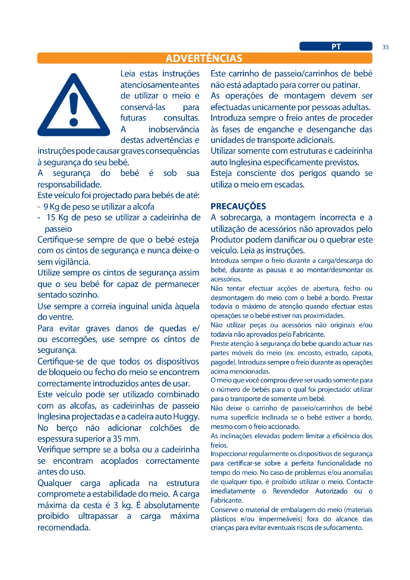 Leia estas instruções atenciosamente antes de utilizar o meio e conservá-las para futuras consultas. A inobservância destas advertências e instruções pode causar graves consequências à segurança do seu bebé. A segurança do bebé é sob sua responsabilidade. Este veículo foi projectado para bebés de até: - 9 Kg de peso se utilizar a alcofa - 15 Kg de peso se utilizar a cadeirinha de passeio Certique-se sempre de que o bebé esteja com os cintos de segurança e nunca deixe-o sem vigilância. Utilize sempre os cintos de segurança assim que o seu bebé for capaz de permanecer sentado sozinho. Use sempre a correia inguinal unida àquela do ventre. Para evitar graves danos de quedas e/ ou escorregões, use sempre os cintos de segurança. Certique-se de que todos os dispositivos de bloqueio ou fecho do meio se encontrem correctamente introduzidos antes de usar. Este veículo pode ser utilizado combinado com as alcofas, as cadeirinhas de passeio Inglesina projectadas e a cadeira auto Huggy. No berço não adicionar colchões de espessura superior a 35 mm. Verique sempre se a bolsa ou a cadeirinha se encontram acoplados correctamente antes do uso. Qualquer carga aplicada na estrutura compromete a estabilidade do meio. A carga máxima da cesta é 3 kg. É absolutamente proibido ultrapassar a carga máxima recomendada. Este carrinho de passeio/carrinhos de bebé não está adaptado para correr ou patinar. As operações de montagem devem ser efectuadas unicamente por pessoas adultas. Introduza sempre o freio antes de proceder às fases de enganche e desenganche das unidades de transporte adicionais. Utilizar somente com estruturas e cadeirinha auto Inglesina especicamente previstos. Esteja consciente dos perigos quando se utiliza o meio em escadas. PRECAUÇÕES A sobrecarga, a montagem incorrecta e a utilização de acessórios não aprovados pelo Produtor podem danicar ou o quebrar este veículo. Leia as instruções. Introduza sempre o freio durante a carga/descarga do bebé, durante as pausas e ao montar/desmontar os acessórios. Não tentar efectuar acções de abertura, fecho ou desmontagem do meio com o bebé a bordo. Prestar todavia o máximo de atenção quando efectuar estas operações se o bebé estiver nas proximidades. Não utilizar peças ou acessórios não originais e/ou todavia não aprovados pelo Fabricante. Preste atenção à segurança do bebe quando actuar nas partes móveis do meio (ex. encosto, estrado, capota, pagode). Introduza sempre o freio durante as operações acima mencionadas. O meio que você comprou deve ser usado somente para o número de bebés para o qual foi projectado: utilizar para o transporte de somente um bebé. Não deixe o carrinho de passeio/carrinhos de bebé numa superfície inclinada se o bebé estiver a bordo, mesmo com o freio accionado. As inclinações elevadas podem limitar a eciência dos freios. Inspeccionar regularmente os dispositivos de segurança para certicar-se sobre a perfeita funcionalidade no tempo do meio. No caso de problemas e/ou anomalias de qualquer tipo, é proibido utilizar o meio. Contacte imediatamente o Revendedor Autorizado ou o Fabricante. Conserve o material de embalagem do meio (materiais plásticos e/ou impermeáveis) fora do alcance das crianças para evitar eventuais riscos de sufocamento. ADVERTÊNCIAS36 A Inglesina Baby S.p.A. declina toda e qualquer responsabilidade por danos causados a coisas ou pessoas oriundos de um uso impróprio e/ou incorrecto do meio. A Inglesina Baby S.p.A. para melhorar os seus produtos se reserva o direito de actualizar e/ou modicar qualquer detalhe técnicos estético sem prévia informação.