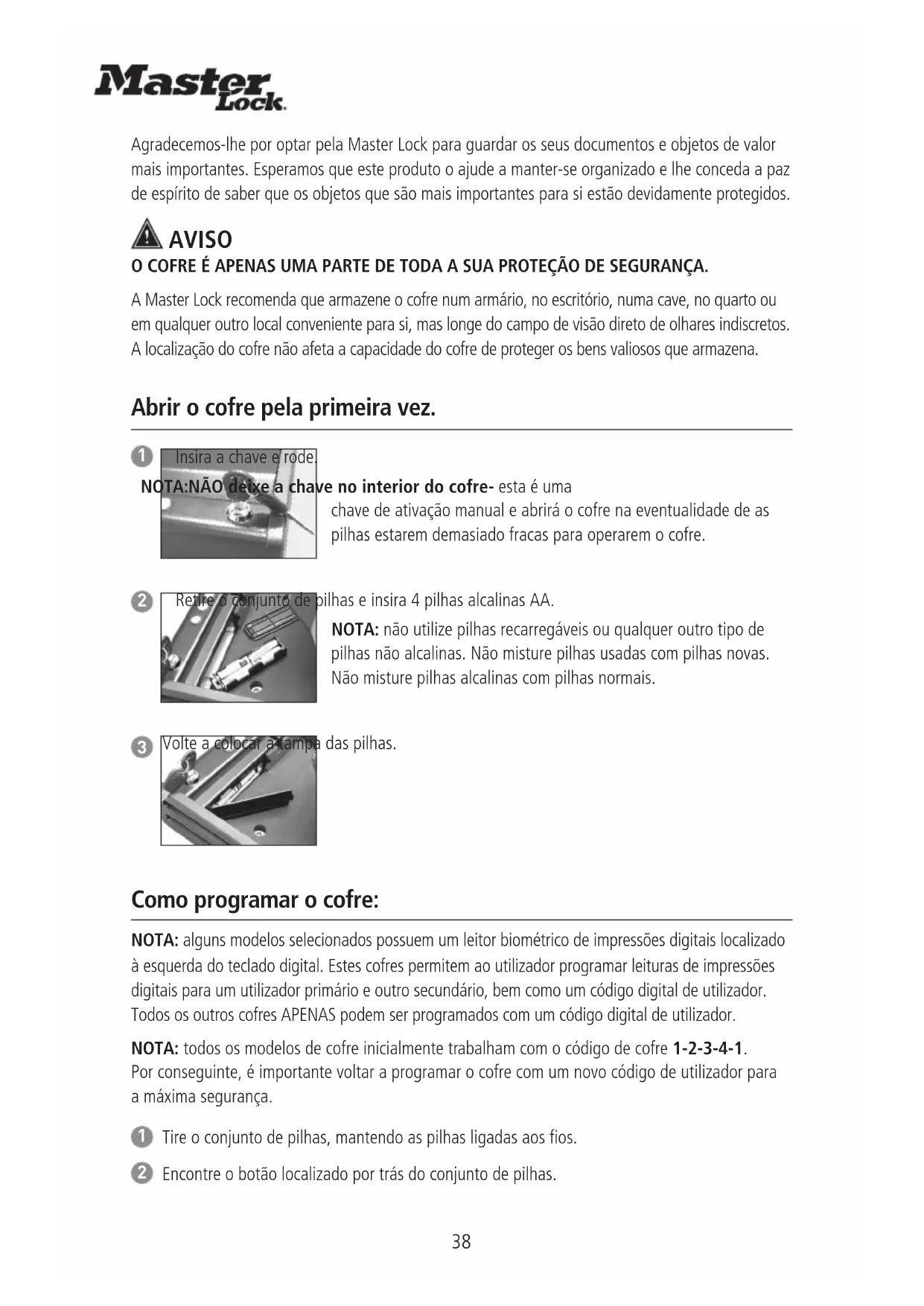 Agradecemos-lhe por optar pela Master Lock para guardar os seus documentos e objetos de valor mais importantes. Esperamos que este produto o ajude a manter-se organizado e lhe conceda a paz de espírito de saber que os objetos que são mais importantes para si estão devidamente protegidos.