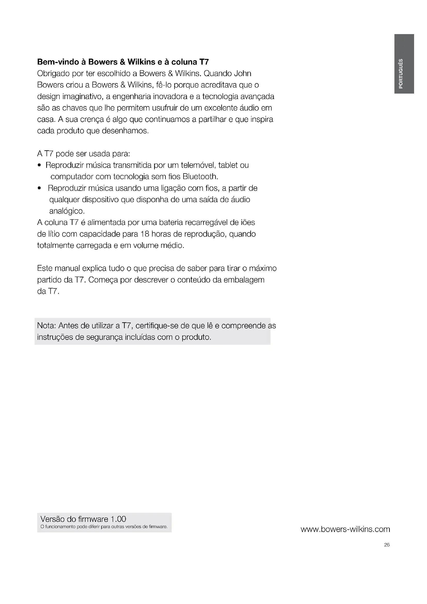 PORTUGUÊS www.bowers-wilkins.com Bem-vindo à Bowers & Wilkins e à coluna T7 Obrigado por ter escolhido a Bowers & Wilkins. Quando John Bowers criou a Bowers & Wilkins, fê-lo porque acreditava que o design imaginativo, a engenharia inovadora e a tecnologia avançada são as chaves que lhe permitem usufruir de um excelente áudio em casa. A sua crença é algo que continuamos a partilhar e que inspira cada produto que desenhamos. A T7 pode ser usada para: