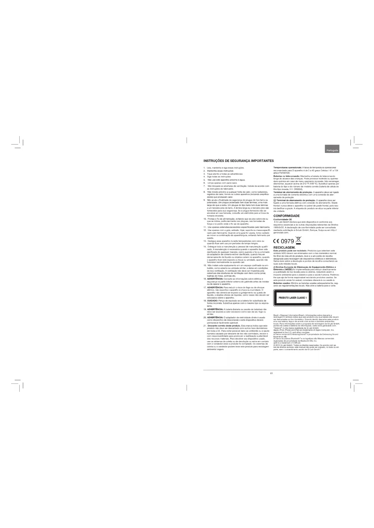 RECICLAGEM. Este produto pode ser reciclado. Produtos que ostentem este símbolo NÃO devem ser eliminados com o lixo doméstico normal. No nal da vida útil do produto, leve-o a um ponto de recolha designado para reciclagem de dispositivos elétricos e eletrónicos. Saiba mais sobre a devolução e pontos de recolha consultando as suas auto-ridades locais. A Diretiva Europeia de Eliminação de Equipamento Elétrico e Eletrónico ( WEEE ) foi implementada para reduzir drasticamente a quantidade de lixo levada para os aterros, reduzindo assim o impacto ambiental para o planeta e para a saúde humana. Pedimos-lhe que aja de forma responsável reciclando produtos usados. Se este produto ainda for usável, considere oferecê-lo ou vendê-lo.Baterias usadas: Elimine as baterias usadas adequadamente, seg-undo as regulamentações locais. Não atire a bateria para o lume.Brazil—Disposal Information/Brasil—Informações sobre descarte e reciclagem:O símbolo indica que este produto e/ou sua bateria não devem ser descartadas no lixo doméstico. Quando decidir descartar este produto e/ou sua bateria, faça-o de acordo com as leis e diretrizes ambientais locais. Para informações sobre o programa de reciclagem da G-Lab GmbH, pontos de coleta e telefone de informações, visite www.genevalab.com.“Geneva é uma marca registrada de G-Lab GmbH. Apple, iPod, iPhone and iPad are trademarks of Apple Computer, Inc. registered in the U.S. and other countriesA marca comercial EmbracingSound é propriedade da Embracing Sound Experience AB.A marca da palavra Bluetooth e os logotipos são Marcas comerciais registradas de propriedade da Bluetooth SIG, Inc. aptX is a trademark of CSR plc© 2013 G-Lab GmbH. Todos os direitos reservados. De acordo com as leis de direitos autorais, este manual não pode ser copiado, no todo ou em parte, sem o consentimento escrito da G-Lab GmbH.”