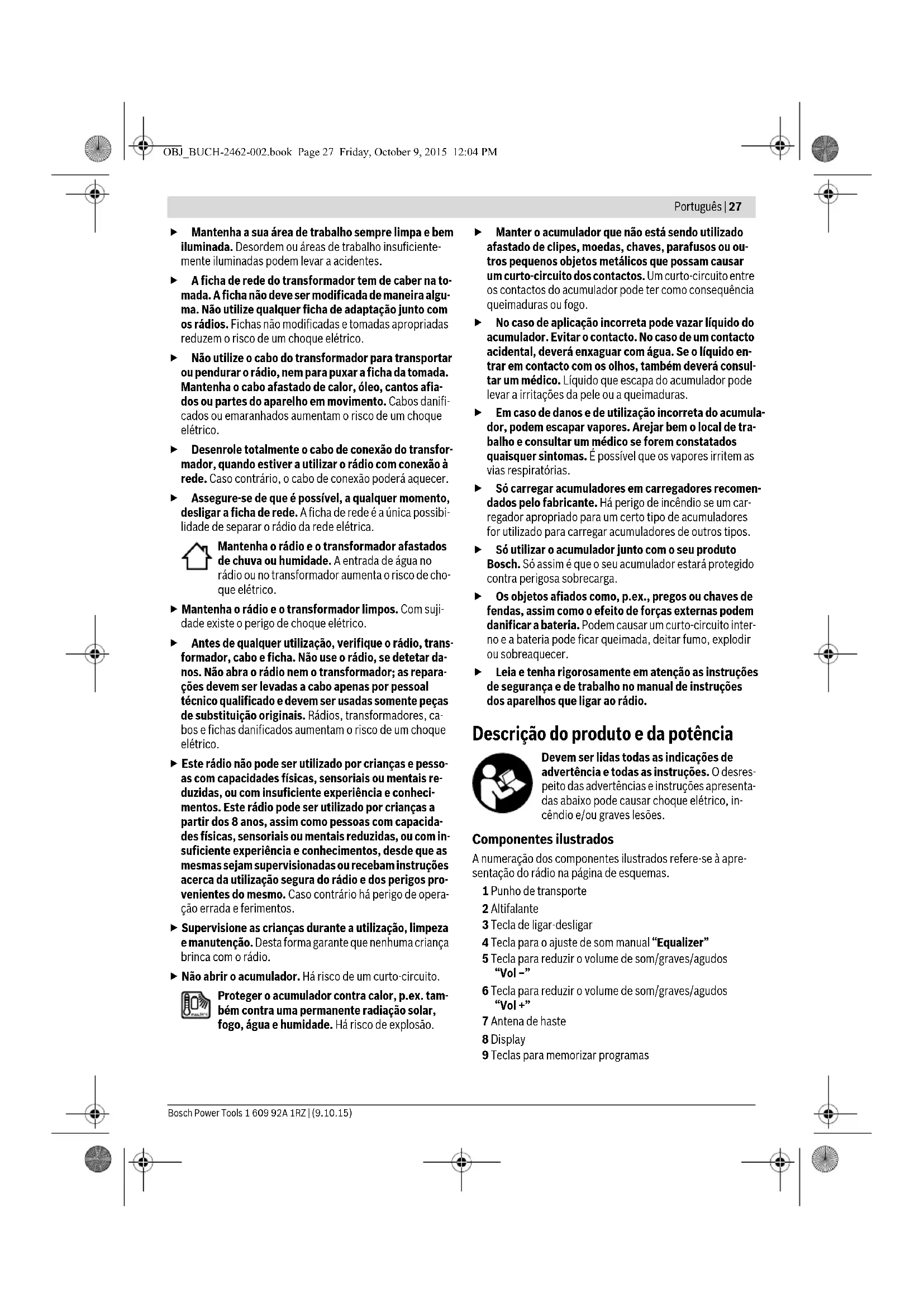 - potência limitada a temperaturas <0 °CDados técnicos averiguados com o acumulador fornecido. OBJ_BUCH-2462-002.book Page 28 Friday, October 9, 2015 12:04 PMPortuguês | 29 Bosch Power Tools 1 609 92A 1RZ | (9.10.15) O indicador do nível de carga da bateria b aparece no mostra- dor, assim que é colocada uma bateria com tensão suficiente e o rádio não estiver ligado à rede elétrica através do transfor- mador 24. A indicação do estado de carga do acumulador b indica o es- tado atual do acumulador. Quando a indicação do estado de carga do acumulador pisca, significa que o acumulador deve ser carregado. Para retirar o acumulador 15 é necessário premir as teclas de destravamento 16 no acumulador e puxá-lo para fora do com- partimento para o acumulador 17. Funcionamento com o conector de fonte de alimentação Observar a tensão de rede! A tensão da fonte de corrente elétrica para o conector de fonte de alimentação deve coincidir com a placa de características do conector de fonte de alimentação. Abrir a tampa de proteção da tomada de conexão de 12 V 23. Enfiar a ficha do aparelho 25 do conector de fonte de alimen- tação na tomada de conexão 23. Ligar o conector de fonte de alimentação à rede elétrica. Utilize exclusivamente o transformador original da Bosch destinado ao seu rádio. Só assim é possível garan- tir o funcionamento correto do rádio. Como proteção contra sujidade deverá fechar novamente a tampa de proteção da tomada de conexão de 12 V 23 após re- mover a ficha do aparelho. Quando não é utilizado, o transformador 24 pode ser armaze- nado no compartimento de armazenamento do rádio. Abra então a alavanca de bloqueio 21 e abra a tampa 20 do com- partimento de armazenamento. Introduzir/substituir as baterias de tampão Para a memorização da hora no rádio, têm de ser colocadas pilhas de reserva. Para isso, é recomendável utilizar pilhas de mangano alcalino. Para abrir a tampa do compartimento das pilhas é necessário soltar o parafuso 18 e retirar a tampa do compartimento das pilhas 19. Colocar as pilhas ou os acumuladores. Observar a polaridade correta de acordo com o lado exterior do compar- timento das pilhas. Recolocar a tampa do compartimento das pilhas 19 e fixá-lo com o parafuso 18. Mude as pilhas de reserva, quando a indicação e se tornar mais fraca e a hora já não for memorizada no rádio. Sempre substituir todas as pilhas ao mesmo tempo. Só utili- zar pilhas de uma marca e com a mesma capacidade. Retire as pilhas de reserva do rádio, sempre que não o utilizar durante longos períodos. Em caso de armazena- mento prolongado, as pilhas de reserva podem ficar corro- ídas ou descarregar-se automaticamente. Funcionamento Proteja o rádio da humidade e da radiação solar direta. O rádio destina-se apenas à utilização em espaços interio- res secos. Funcionamento Audio Ligar e desligar Para ligar o rádio, prima a tecla de ligar-desligar 3. O mostra- dor 8 é ativado e é reproduzida a fonte de áudio que estava definida quando o rádio foi desligado pela última vez. Nota: Na primeira utilização com pilhas ou após um período de não utilização prolongado do rádio, pode ser necessário premir várias vezes ou mais demoradamente a tecla de li- gar/desligar 3 para ligar o rádio. O display 8 é iluminado durante alguns segundos a cada pres- são de tecla. Para desligar o rádio, prima novamente a tecla de ligar-desli- gar 3. É memorizada a definição atual da fonte de áudio. Para poupar energia, ligue o rádio apenas quando o usar. Ajustar o volume de som Depois de ligar o rádio, está sempre definido um volume de som médio (valor 10). Para aumentar o volume de som deverá premir a tecla “Vol +” 6, para diminuir o volume de som, a tecla “Vol –” 5. O ajuste do volume de som “VL” aparece com o valor entre 0 e 20 du- rante alguns segundos na indicação e do display. Ajustar o volume de som num valor baixo antes de sintonizar uma emissora de rádio ou antes de mudar para outra, e num valor médio antes de iniciar uma fonte Audio externa. Para desligar o som poderá premir a tecla “Mute” 13. Para li- gar novamente o som deverá premir novamente a tecla “Mute” 13 ou a tecla “Vol +” 6 ou “Vol –” 5. Ajustar o som Para uma reprodução de som ideal, o rádio tem um equaliza- dor integrado. Para mudar o nível de graves manualmente deverá premir uma vez a tecla “Equalizer” 4. No display aparece “BA” e o valor ajustado do nível de graves na indicação e. Para o nível de agudos deverá premir novamente a tecla “Equalizer” 4 , na indicação e aparece “TR” e o valor memorizado do nível de agudos. O nível de graves e agudos pode ser alterado numa faixa de –5 a +5. Para aumentar o valor indicado deverá premir res- petivamente a tecla “Vol +” 6 e para reduzir, a tecla “Vol –”