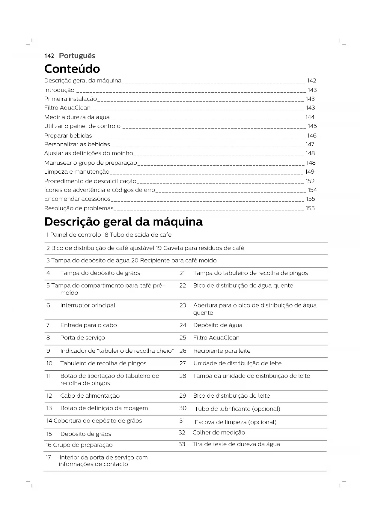 NorskConteúdo Descrição geral da máquina________________________________________________________ 142 Introdução ______________________________________________________________________ 143 Primeira instalação_______________________________________________________________ 143 Filtro AquaClean_________________________________________________________________ 143 Medir a dureza da água___________________________________________________________ 144 Utilizar o painel de controlo ________________________________________________________ 145 Preparar bebidas_________________________________________________________________ 146 Personalizar as bebidas___________________________________________________________ 147 Ajustar as definições do moinho____________________________________________________ 148 Manusear o grupo de preparação___________________________________________________ 148 Limpeza e manutenção___________________________________________________________ 149 Procedimento de descalcificação___________________________________________________ 152 Ícones de advertência e códigos de erro______________________________________________ 154 Encomendar acessórios___________________________________________________________ 155 Resolução de problemas__________________________________________________________ 155 Descrição geral da máquina 1 Painel de controlo 18 Tubo de saída de café 2 Bico de distribuição de café ajustável 19 Gaveta para resíduos de café 3 Tampa do depósito de água 20 Recipiente para café moído 4 Tampa do depósito de grãos 21 Tampa do tabuleiro de recolha de pingos 5 Tampa do compartimento para café pré- moído 22 Bico de distribuição de água quente 6 Interruptor principal 23 Abertura para o bico de distribuição de água quente 7 Entrada para o cabo 24 Depósito de água 8 Porta de serviço 25 Filtro AquaClean 9 Indicador de "tabuleiro de recolha cheio" 26 Recipiente para leite 10 Tabuleiro de recolha de pingos 27 Unidade de distribuição de leite 11 Botão de libertação do tabuleiro de recolha de pingos 28 Tampa da unidade de distribuição de leite 12 Cabo de alimentação 13 Botão de definição da moagem 29 Bico de distribuição de leite