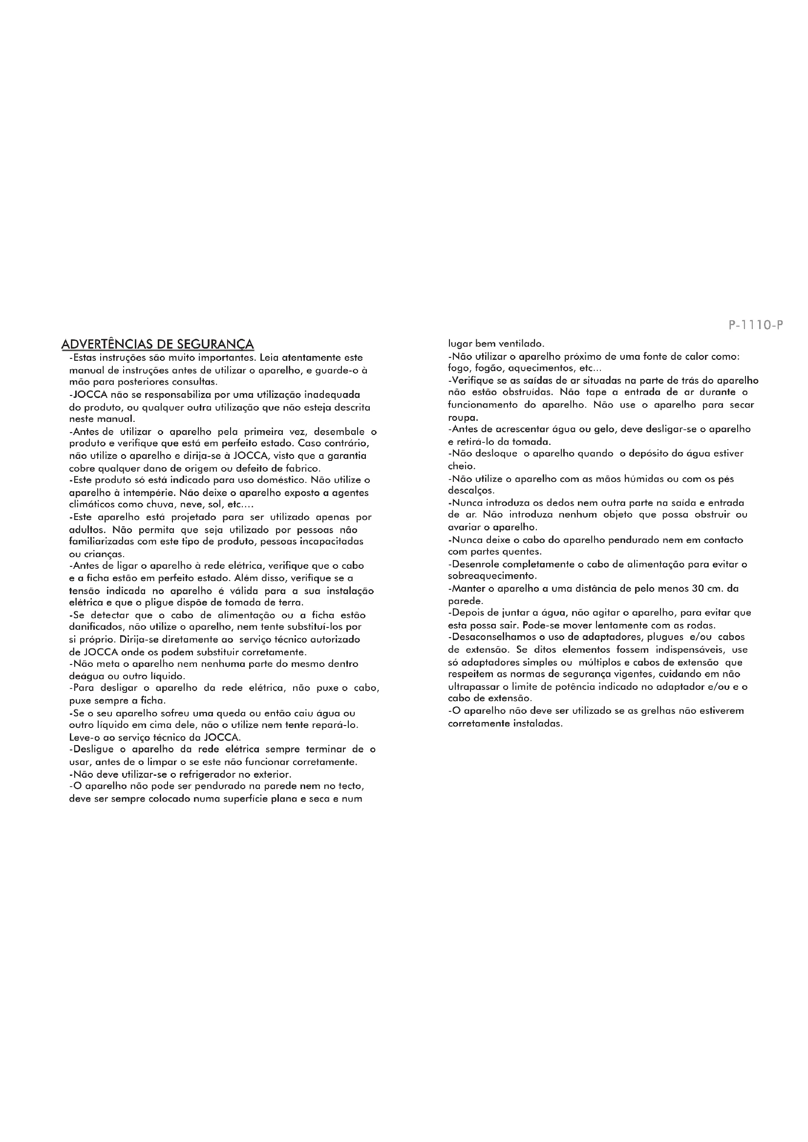 -Estas instruções são muito importantes. Leia atentamente este manual de instruções antes de utilizar o aparelho, e guarde-o à mão para posteriores consultas. -JOCCA não se responsabiliza por uma utilização inadequada do produto, ou qualquer outra utilização que não esteja descrita neste manual. -Antes de utilizar o aparelho pela primeira vez, desembale o produto e verifique que está em perfeito estado. Caso contrário, não utilize o aparelho e dirija-se à JOCCA, visto que a garantia cobre qualquer dano de origem ou defeito de fabrico. -Este produto só está indicado para uso doméstico. Não utilize o aparelho à intempérie. Não deixe o aparelho exposto a agentes climáticos como chuva, neve, sol, etc.… -Este aparelho está projetado para ser utilizado apenas por adultos. Não permita que seja utilizado por pessoas não familiarizadas com este tipo de produto, pessoas incapacitadas ou crianças. -Antes de ligar o aparelho à rede elétrica, verifique que o cabo e a ficha estão em perfeito estado. Além disso, verifique se a tensão indicada no aparelho é válida para a sua instalação elétrica e que o pligue dispõe de tomada de terra. -Se detectar que o cabo de alimentação ou a ficha estão danificados, não utilize o aparelho, nem tente substituí-los por si próprio. Dirija-se diretamente ao serviço técnico autorizado de JOCCA onde os podem substituir corretamente. -Não meta o aparelho nem nenhuma parte do mesmo dentro deágua ou outro líquido. -Para desligar o aparelho da rede elétrica, não puxe o cabo, puxe sempre a ficha. -Se o seu aparelho sofreu uma queda ou então caiu água ou outro líquido em cima dele, não o utilize nem tente repará-lo. Leve-o ao serviço técnico da JOCCA. -Desligue o aparelho da rede elétrica sempre terminar de o usar, antes de o limpar o se este não funcionar corretamente. -Não deve utilizar-se o refrigerador no exterior. -O aparelho não pode ser pendurado na parede nem no tecto, deve ser sempre colocado numa superfície plana e seca e num lugar bem ventilado. -Não utilizar o aparelho próximo de uma fonte de calor como: fogo, fogão, aquecimentos, etc... -Verifique se as saídas de ar situadas na parte de trás do aparelho não estão obstruídas. Não tape a entrada de ar durante o funcionamento do aparelho. Não use o aparelho para secar roupa. -Antes de acrescentar água ou gelo, deve desligar-se o aparelho e retirá-lo da tomada. -Não desloque o aparelho quando o depósito do água estiver cheio. -Não utilize o aparelho com as mãos húmidas ou com os pés descalços. -Nunca introduza os dedos nem outra parte na saída e entrada de ar. Não introduza nenhum objeto que possa obstruir ou avariar o aparelho. -Nunca deixe o cabo do aparelho pendurado nem em contacto com partes quentes. -Desenrole completamente o cabo de alimentação para evitar o sobreaquecimento. -Manter o aparelho a uma distância de pelo menos 30 cm. da parede. -Depois de juntar a água, não agitar o aparelho, para evitar que esta possa sair. Pode-se mover lentamente com as rodas. -Desaconselhamos o uso de adaptadores, plugues e/ou cabos de extensão. Se ditos elementos fossem indispensáveis, use só adaptadores simples ou múltiplos e cabos de extensão que respeitem as normas de segurança vigentes, cuidando em não ultrapassar o limite de potência indicado no adaptador e/ou e o cabo de extensão. -O aparelho não deve ser utilizado se as grelhas não estiverem corretamente instaladas.