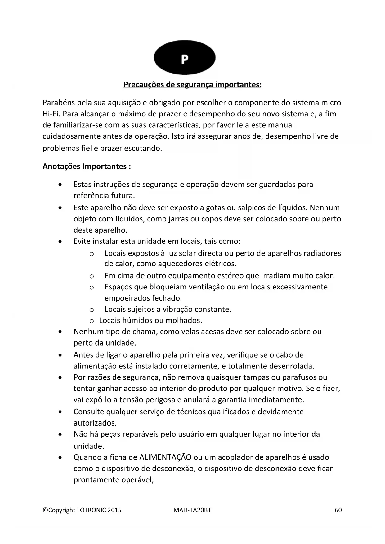 - Quando a ficha de ALIMENTAÇÃO ou um acoplador de aparelhos é usado como o dispositivo de desconexão, o dispositivo de desconexão deve ficar prontamente operável;©Copyright LOTRONIC 2015 MAD-TA20BT 61