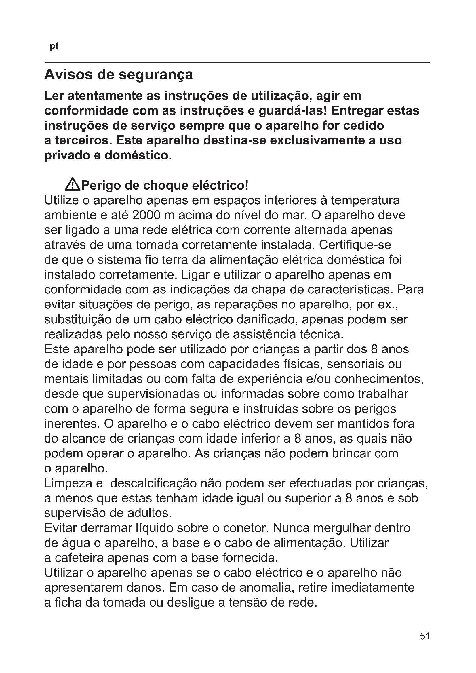 Avisos de segurança Ler atentamente as instruções de utilização, agir em conformidade com as instruções e guardá-las! Entregar estas instruções de serviço sempre que o aparelho for cedido a terceiros. Este aparelho destina-se exclusivamente a uso privado e doméstico. WPerigo de choque eléctrico! Utilize o aparelho apenas em espaços interiores à temperatura ambiente e até 2000 m acima do nível do mar. O aparelho deve ser ligado a uma rede elétrica com corrente alternada apenas através de uma tomada corretamente instalada. Certique-se de que o sistema o terra da alimentação elétrica doméstica foi instalado corretamente. Ligar e utilizar o aparelho apenas em conformidade com as indicações da chapa de características. Para evitar situações de perigo, as reparações no aparelho, por ex., substituição de um cabo eléctrico danicado, apenas podem ser realizadas pelo nosso serviço de assistência técnica. Este aparelho pode ser utilizado por crianças a partir dos 8 anos de idade e por pessoas com capacidades físicas, sensoriais ou mentais limitadas ou com falta de experiência e/ou conhecimentos, desde que supervisionadas ou informadas sobre como trabalhar com o aparelho de forma segura e instruídas sobre os perigos inerentes. O aparelho e o cabo eléctrico devem ser mantidos fora do alcance de crianças com idade inferior a 8 anos, as quais não podem operar o aparelho. As crianças não podem brincar com o aparelho. Limpeza e descalcicação não podem ser efectuadas por crianças, a menos que estas tenham idade igual ou superior a 8 anos e sob supervisão de adultos. Evitar derramar líquido sobre o conetor. Nunca mergulhar dentro de água o aparelho, a base e o cabo de alimentação. Utilizar a cafeteira apenas com a base fornecida. Utilizar o aparelho apenas se o cabo eléctrico e o aparelho não apresentarem danos. Em caso de anomalia, retire imediatamente a cha da tomada ou desligue a tensão de rede.52